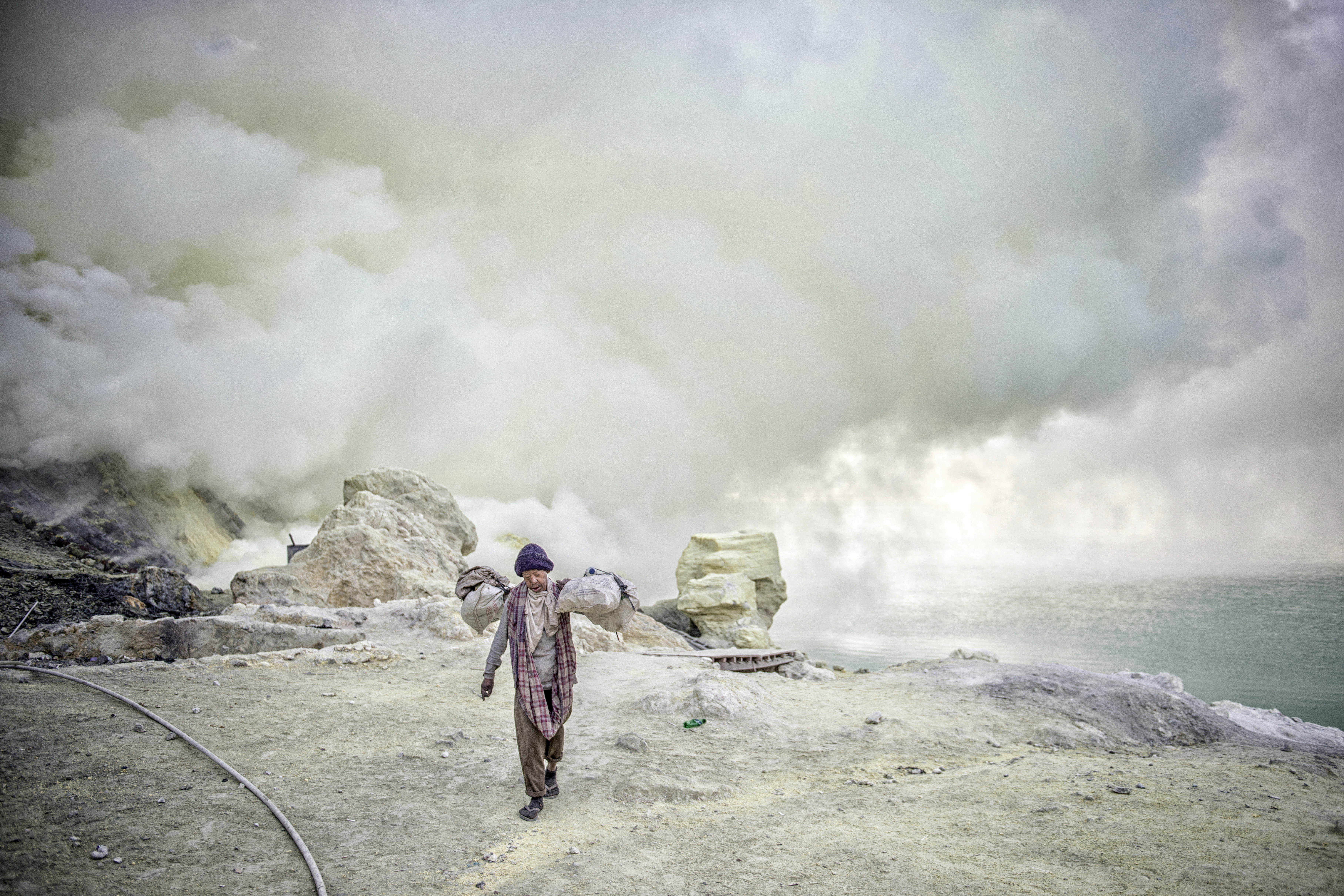 Zwavel mijnwerker in de krater van vulkaan Kawah Ijen op het eiland Java in Indonesie.
