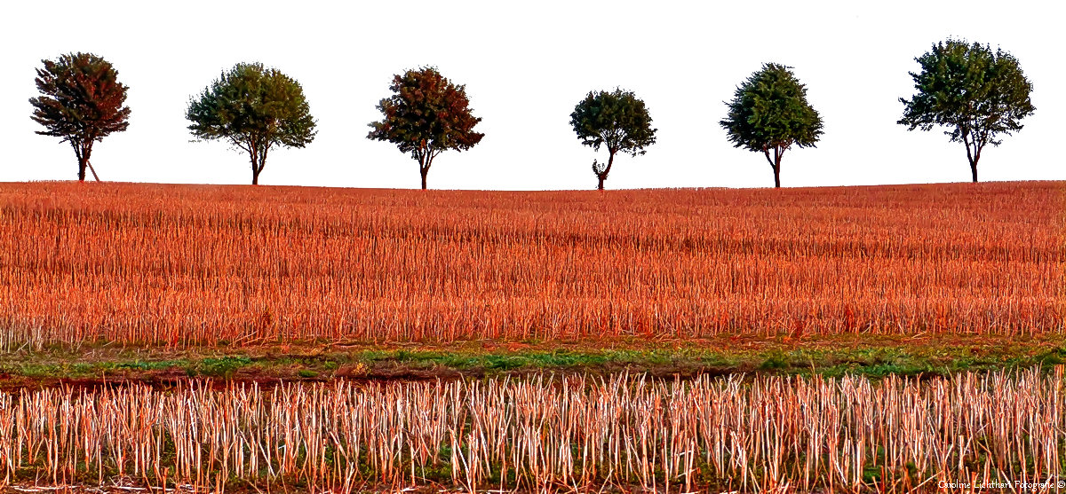 Door de avondzon verlichte oude stengels op een koolzaadveld. Hierachter een pad met een bomenrij.