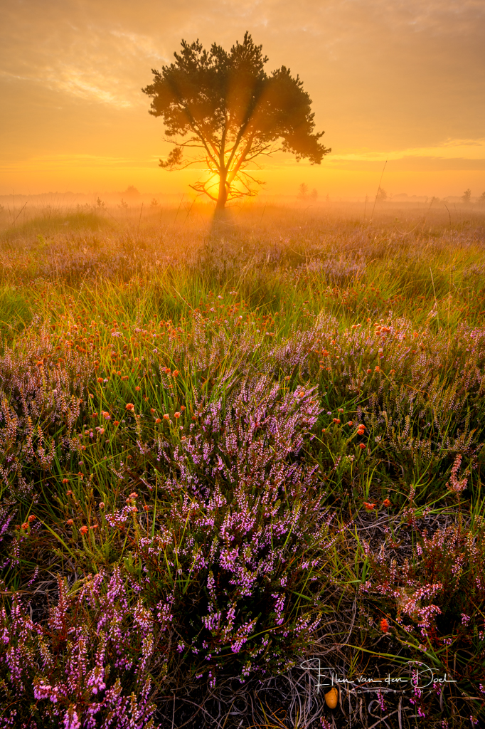 Zonsopkomst tijdens een prachtige ochtend met wat mist zorgt voor wat zonnestralen door het eenzame boompje.