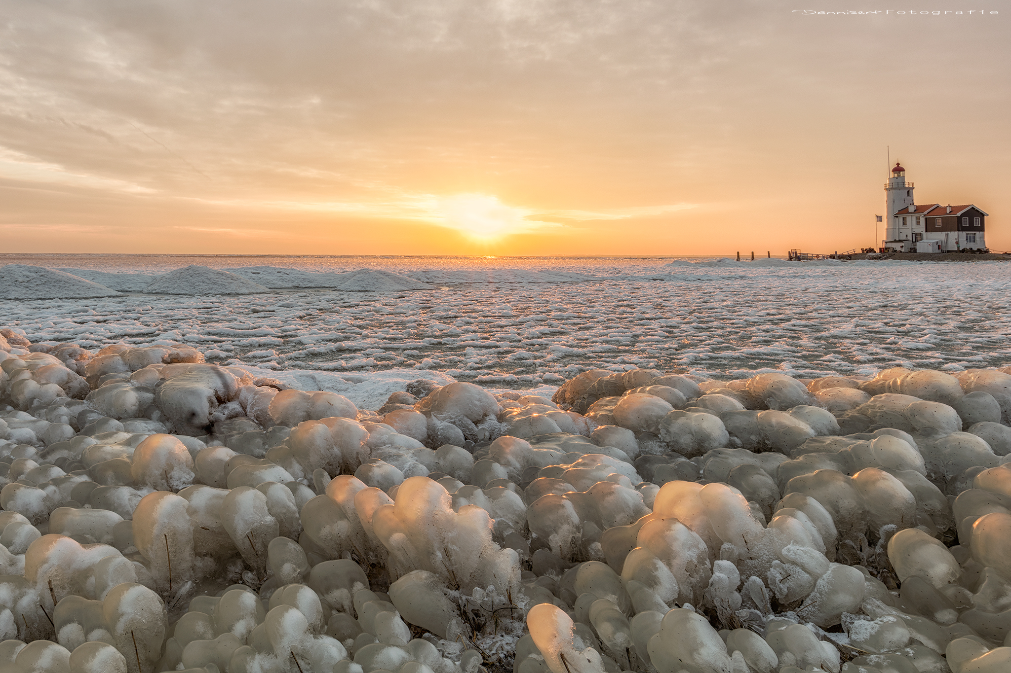 De zon kwam er nog even doorheen waardoor er een mooie gloed over het bevroren ijs kwam.