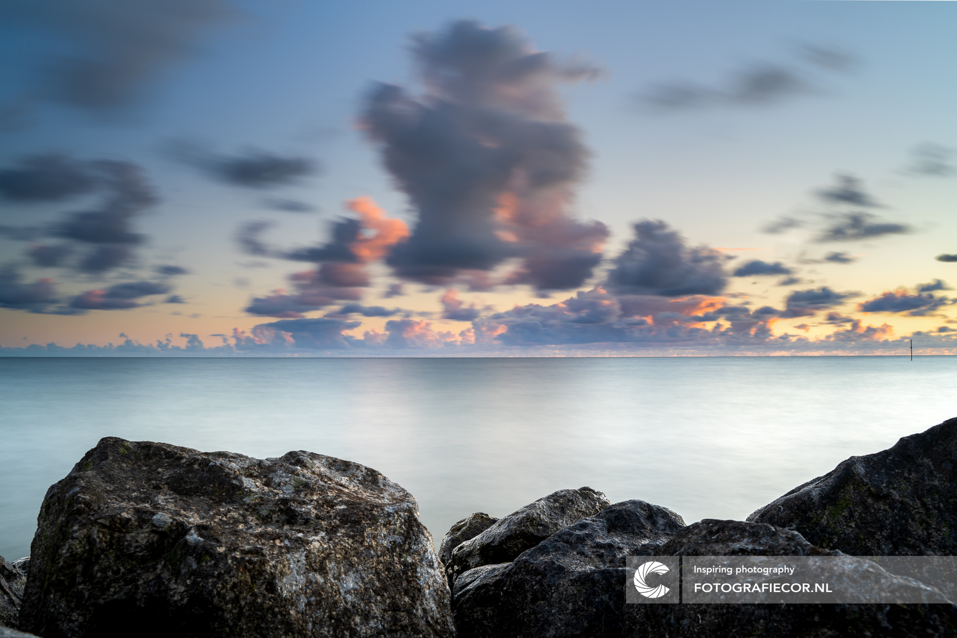 Mooie avonden langs de oevers van het IJsselmeer. Overdrijvende wolken en een eindeloze rechte horizon.