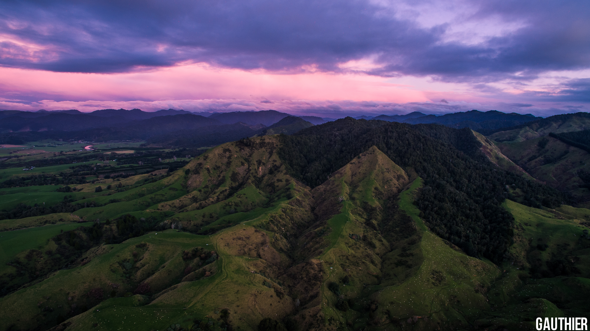 Ik ben een 19-jarig wereldreiziger. Momenteel ben ik in Nieuw Zeeland. Ik nam deze foto met de DJI Phantom 4, rond 17u, zonsondergang. Elke avond is de paars/roze lucht te zien, machtig.