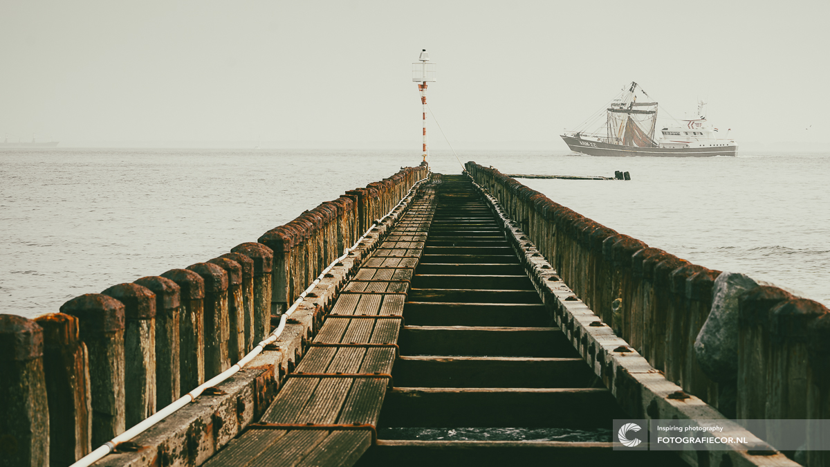 Een lichte zeemist zorgde voor de sfeer in deze foto waarbij het landschap een minimalistisch en intiemer karakter kreeg. In de verte een kotter die de haven van Vlissingen weer opzoekt maar eerst de kenmerkende houten pier moet passeren. In de compositie er bewust voor gekozen om de boot hier te positioneren kwa vlakverdeling en de regel van derden. De lijdende lijnen geven perpectief aan de compositie terwijl de boot en de horizon weer een tegenovergestelde dynamiek toevoegen.