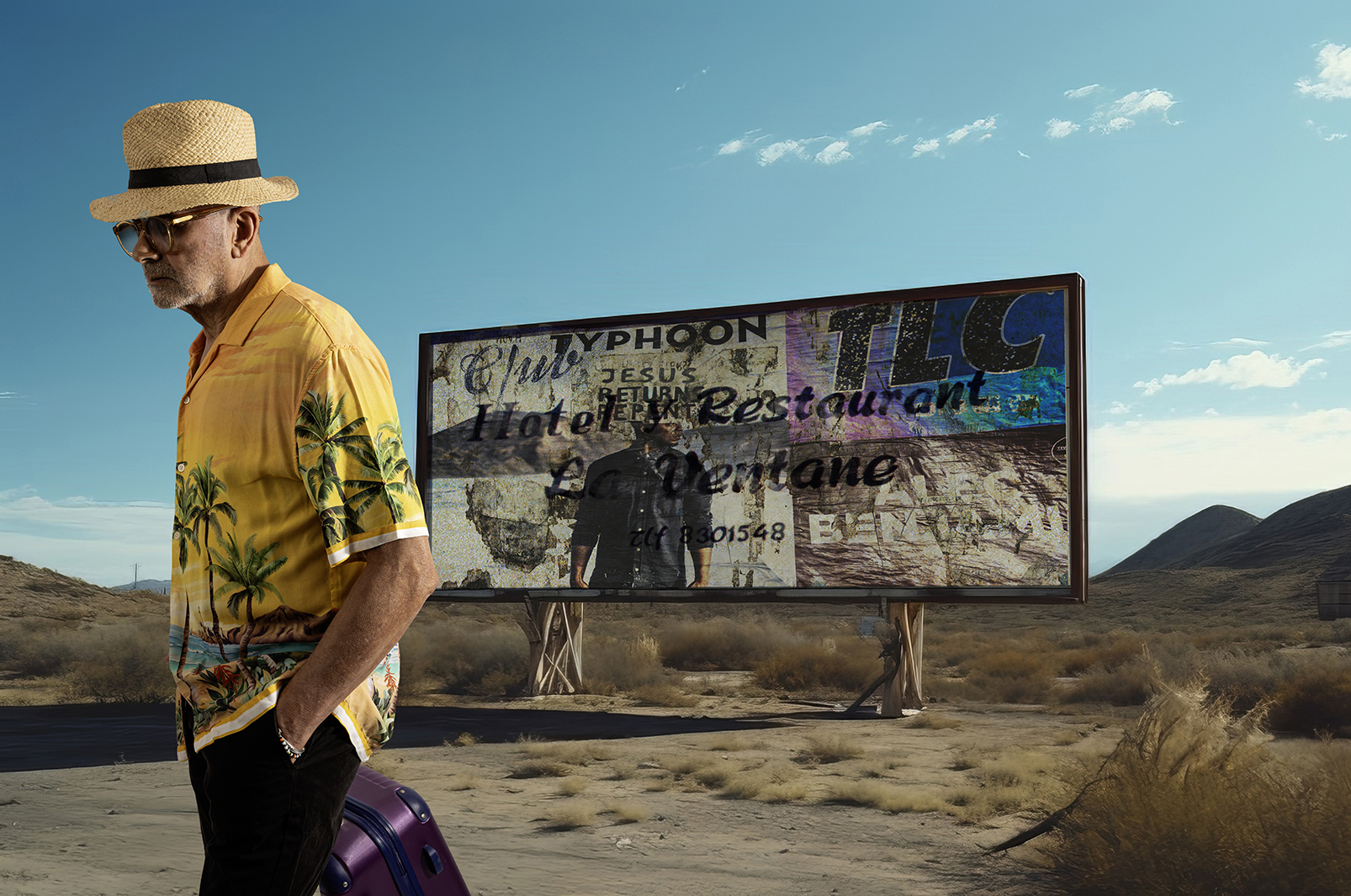 Oudere man met rolkoffer in hawaiishirt in een desolaat landschap