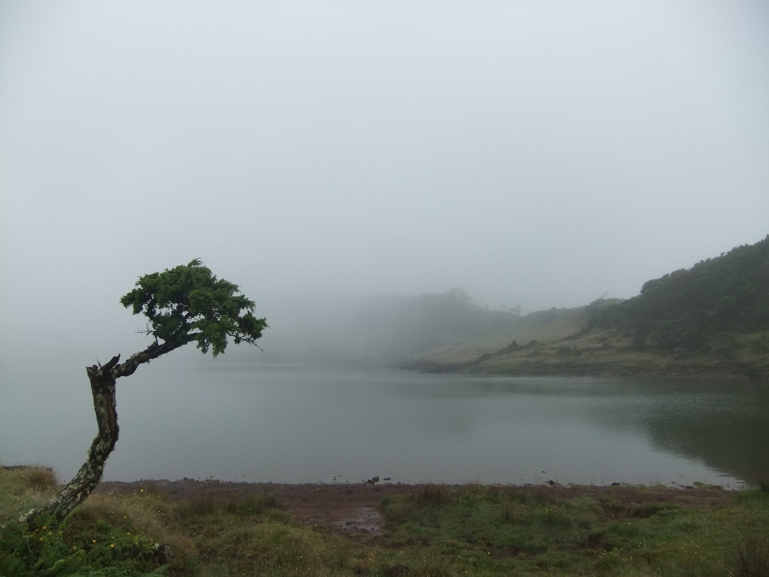 Op een vulkaanhelling van de Azoren, een verweerde taxus in de mist.