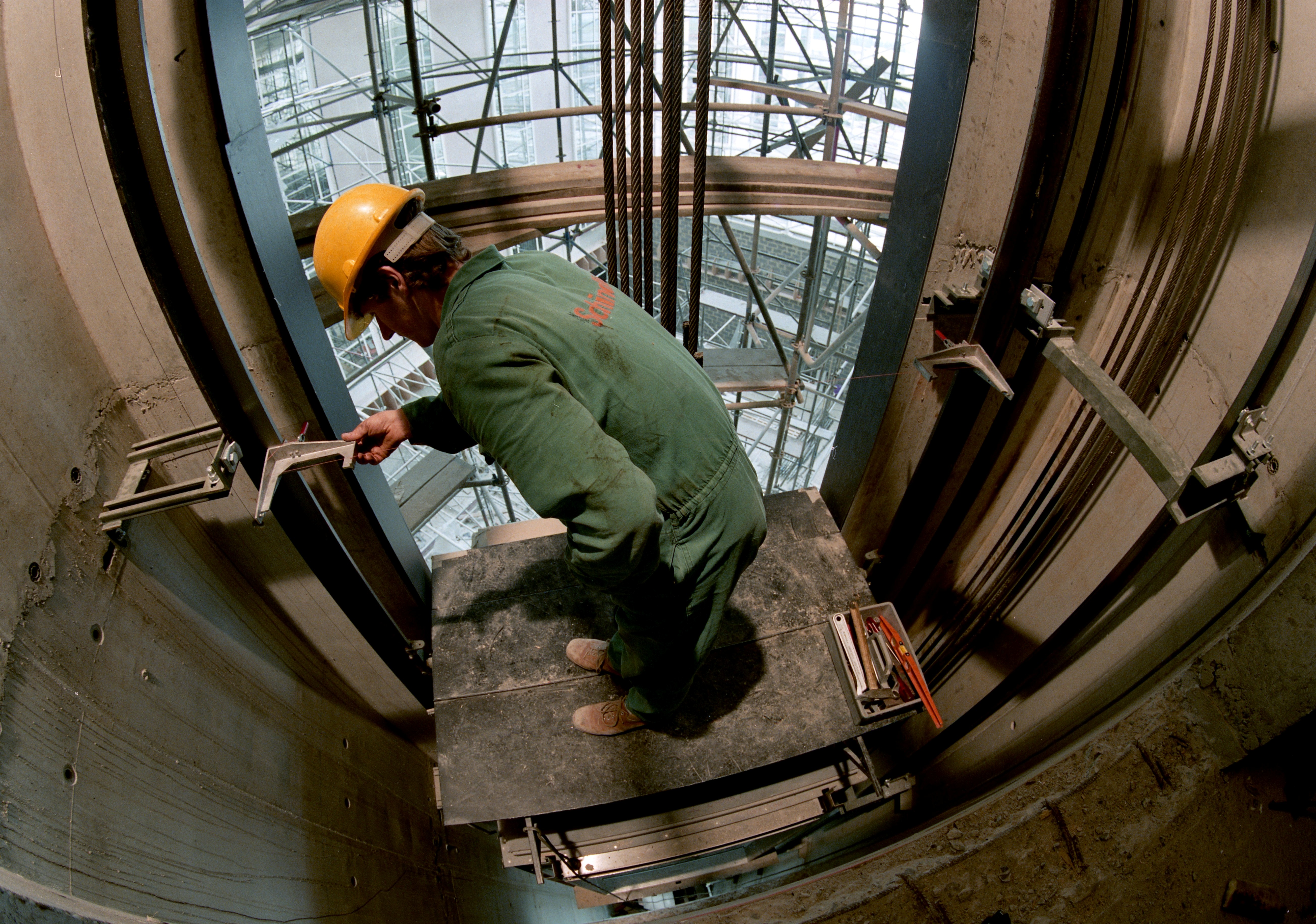 Arbeider installeert lift in een nieuw gebouw