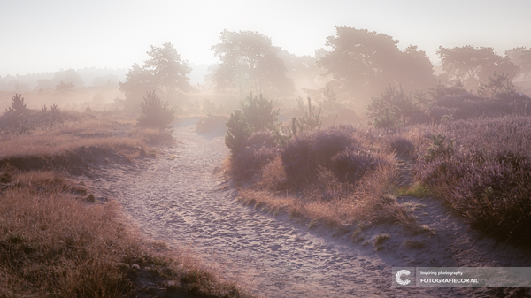 Wanneer de bewolking in de vroege ochtend eindelijk de zon doorlaat staat deze eigenlijk al een beetje te hoog aan de hemel. Binnen een oogwenk zal de mist verdwenen zijn maar dat moment voordat het gebeurd is de bloeiende heide en het unieke landschap van de Kale duinen bij de plaats Appelscha nog even in mystieke nevelen gehuld.🌫🌤