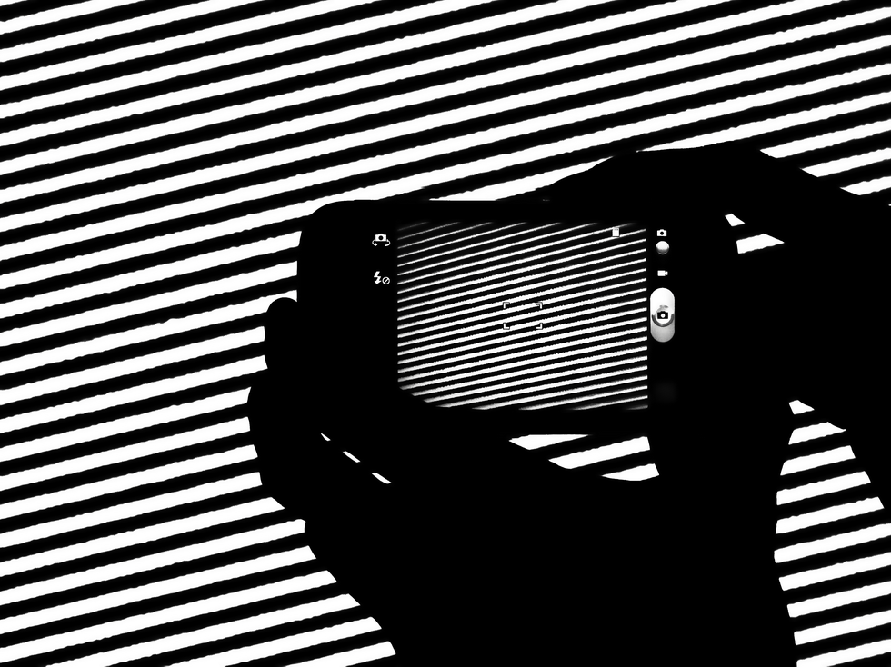 Een storingsbeeld op televisie gefotografeerd met een door mensen vastgehouden mobiele telefoon.