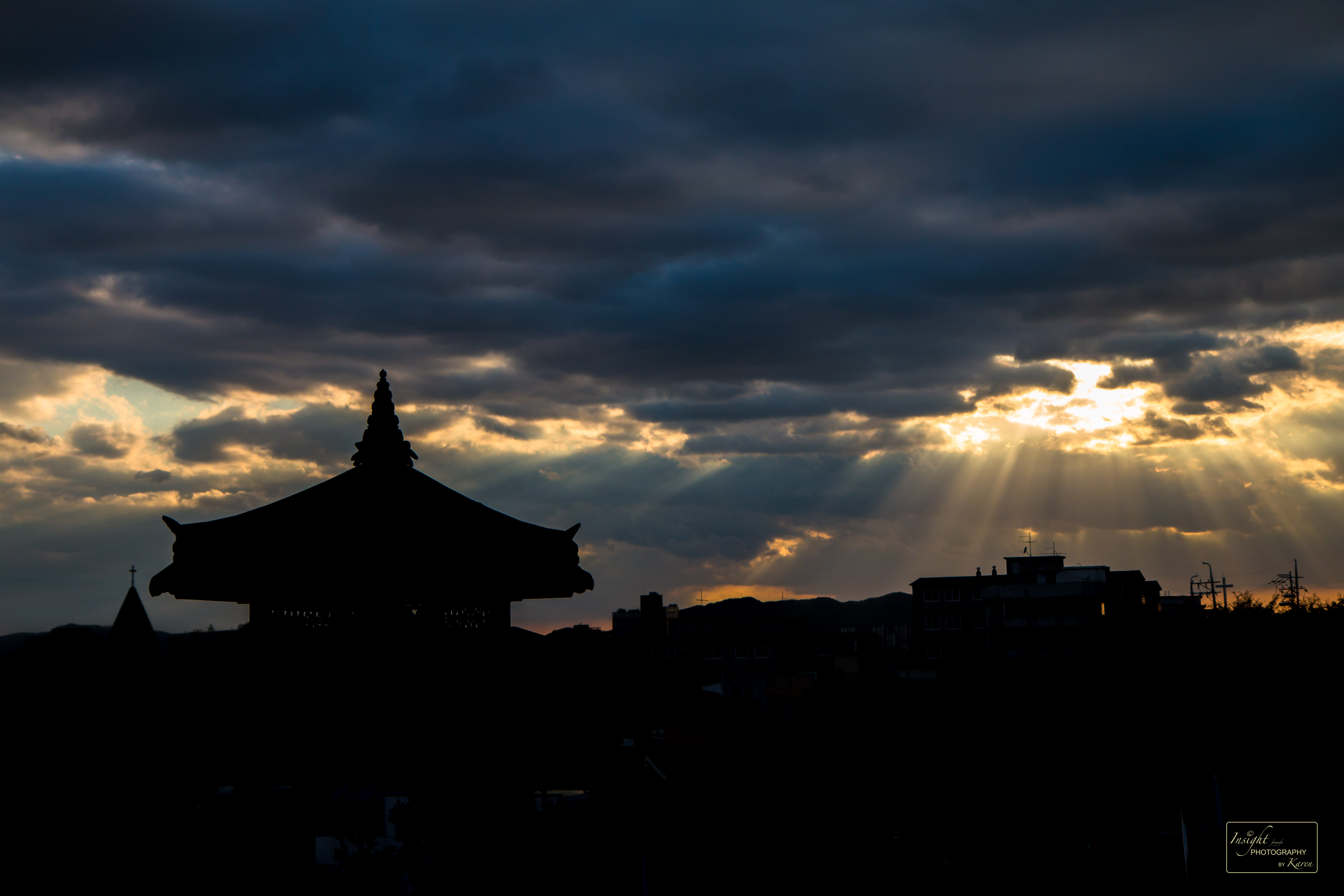 Prachtige zonsondergang vlakbij een tempel in Suwon, Zuid-Korea