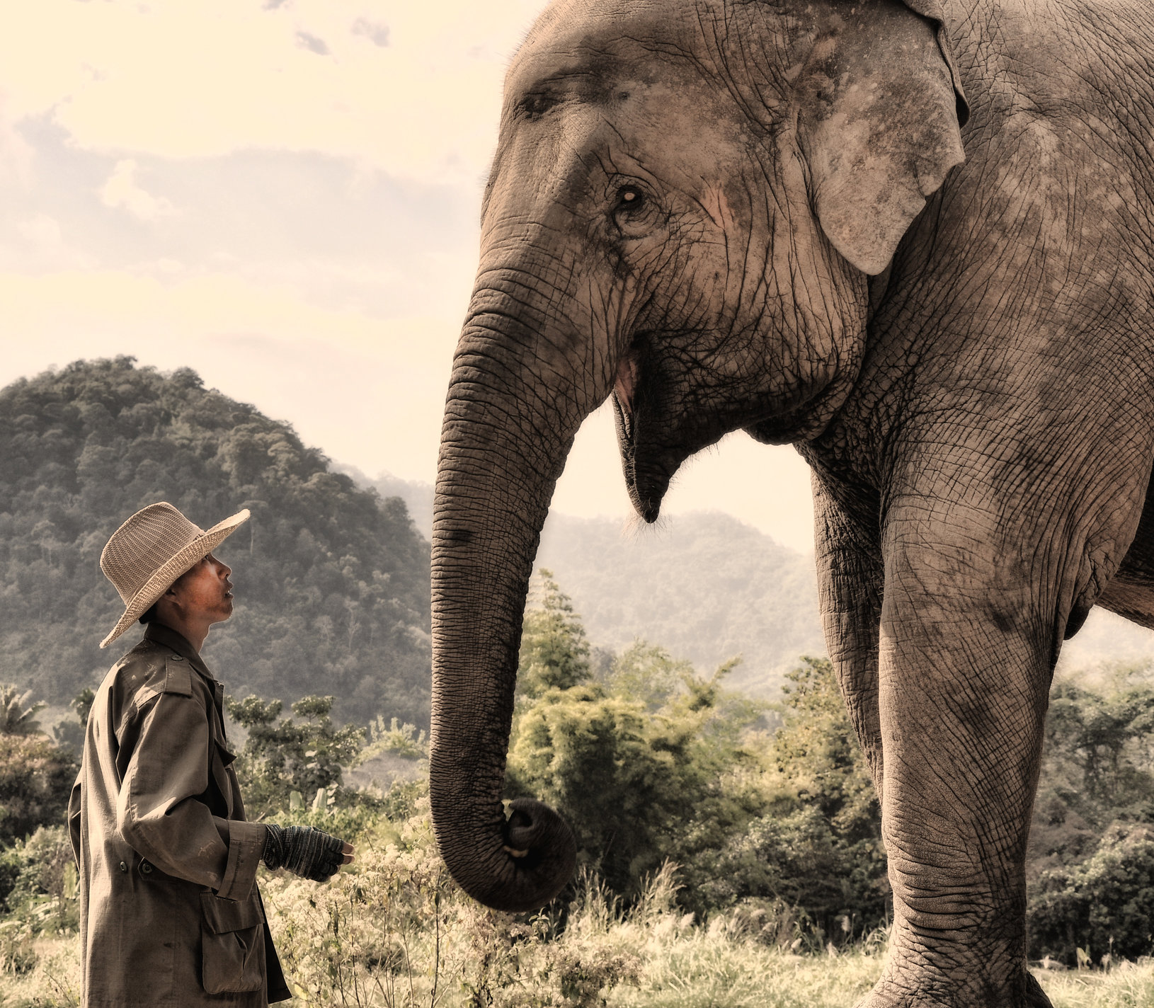Een mahout maakt geconcentreerd contact met zijn olifant. Het schijnt dat olifanten zelf hun mahout uitkiezen (soms pas na enkele dagen). Niet elke combinatie is een goede match. De synergie tussen beiden moet kloppen. Zodra een keuze gemaakt is, is deze voor het leven.