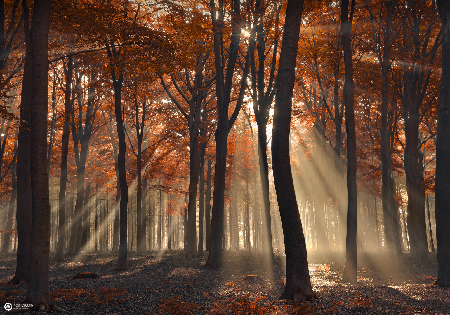 Zonnestralen in het herfstbos op een ochtend in de buurt van Esbeek.