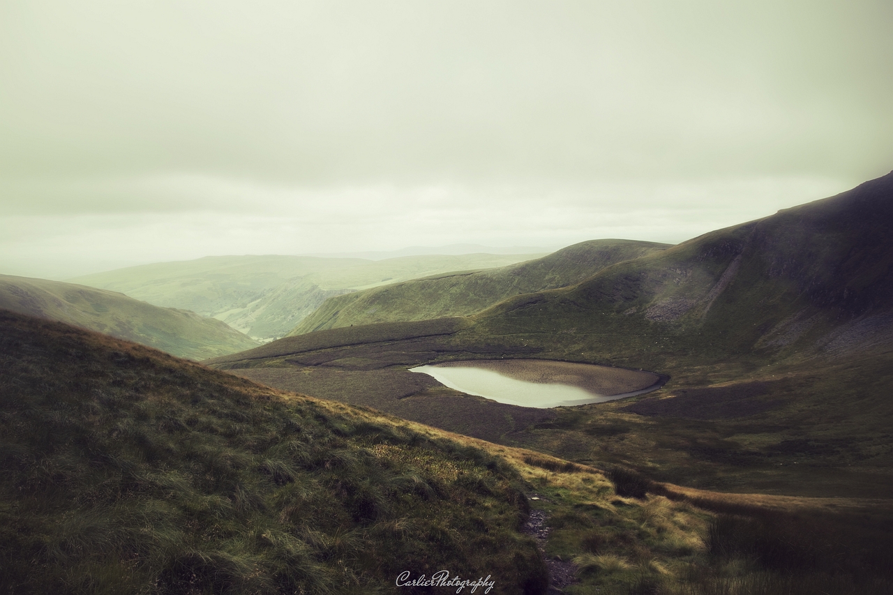Klein meer in een prachtig gebied in Wales, geen toeristen, veel schapen, heerlijk de rust, de wind door je haren, de vergezichten en de telkens veranderende luchten