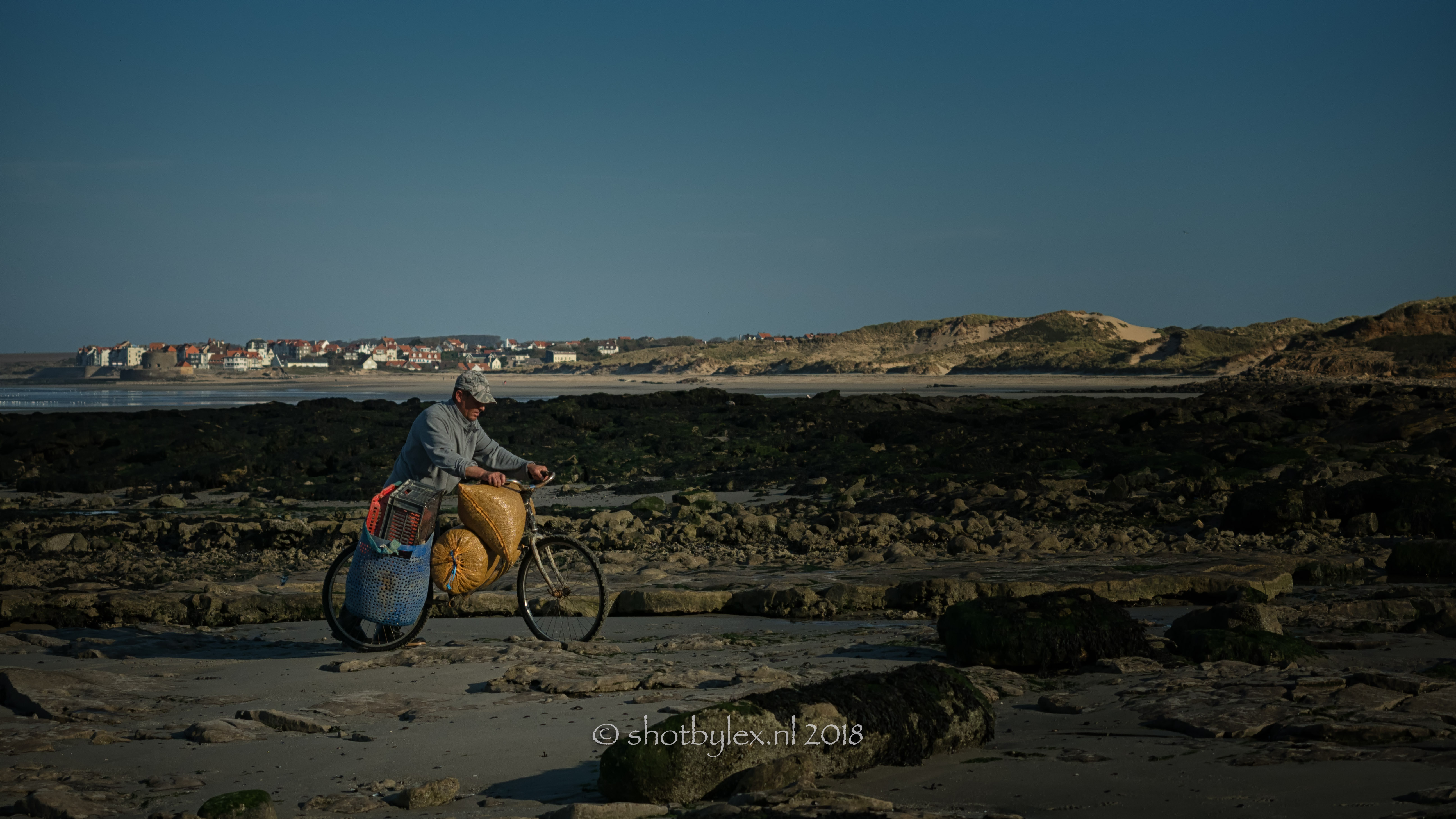 Een mosselvisser bij Wimereux brengt zijn vangst naar de ksut voor de vloed de mosselbanken weer overspoeld.