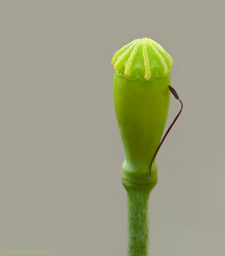 Een Klaproos met een laatste meeldraadje in een bijzondere pose.