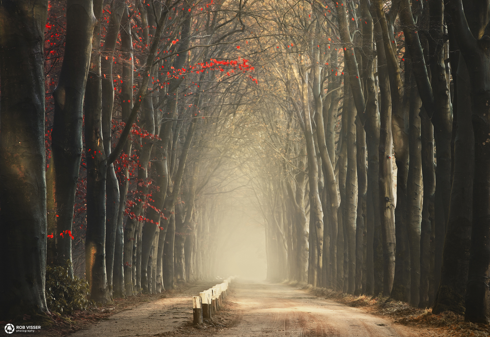 Rode herfstblaadjes in het mistige bos op landgoed Gorp en Roovert.
