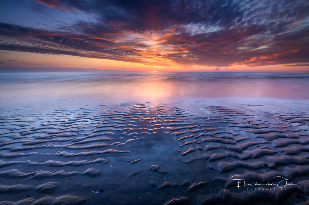 Wanneer het eb wordt zijn er vaak mooie structuren te vinden op het strand. De combinatie met zo'n zonsondergang maakt het feest dan wel compleet. :-) Dit was afgelopen week op de Brouwersdam.