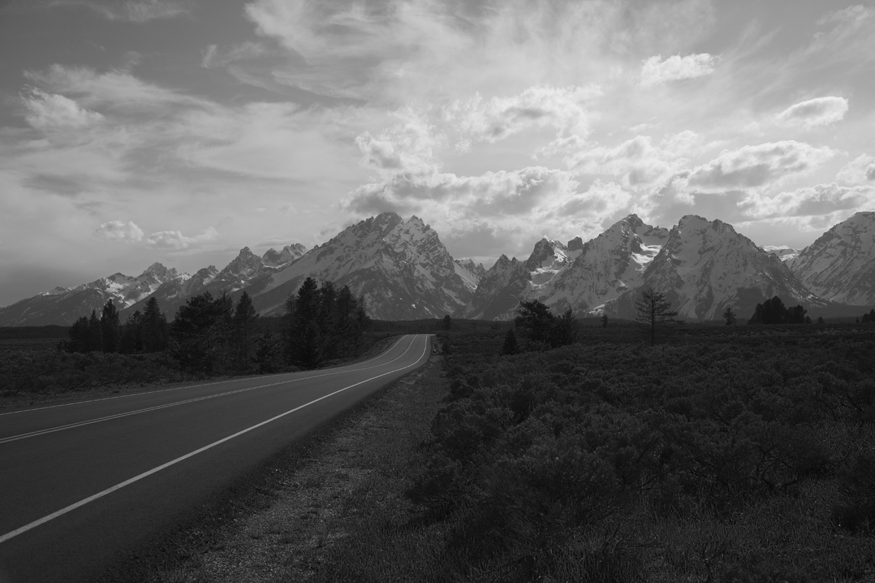 A road to the grand masive of Mount Teton in Teton national Park, Wyoming, USA