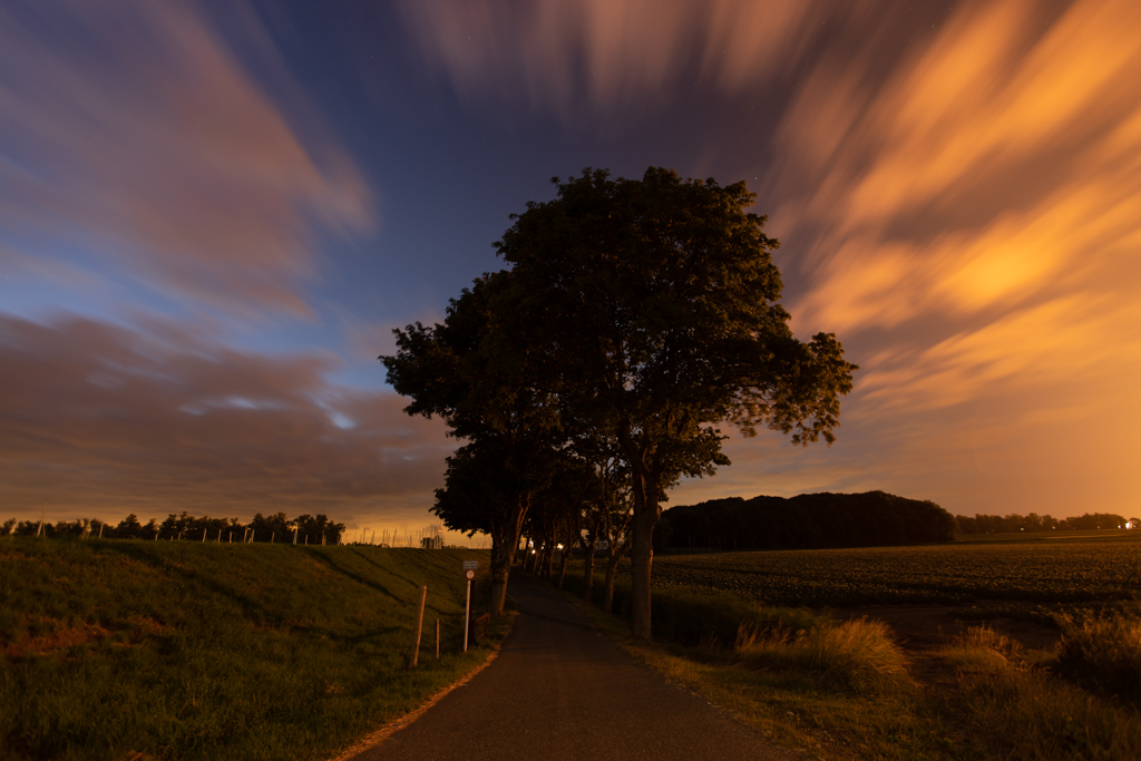Een nachtelijke foto aan de rand van een industriegebied, de oranje gloed die je ziet komt van een fabriek die aan het opstarten is waardoor deze overtollige gassen moet affakkelen