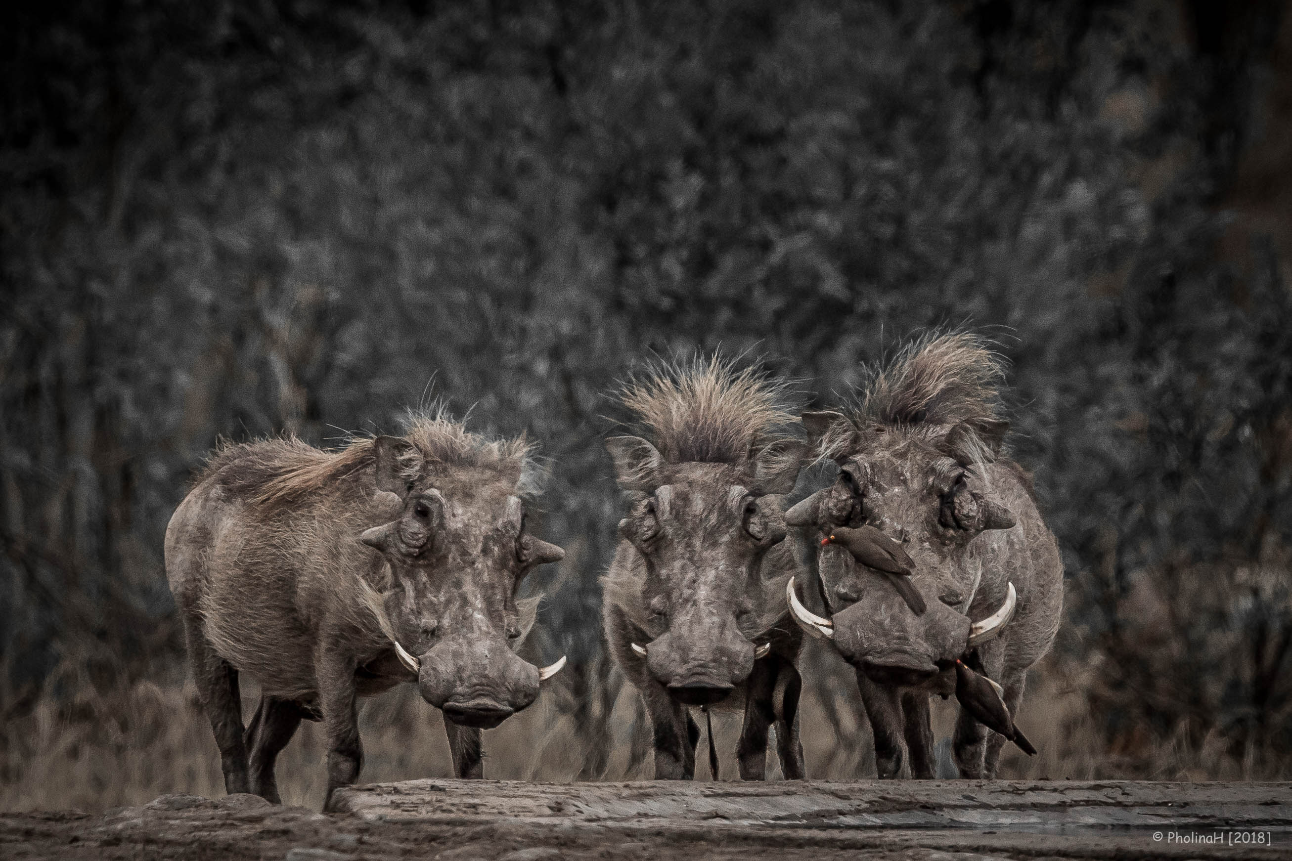 Drie knobbelzwijnen en enkele ossenpikkers in het Kruger Park, Zuid Afrika