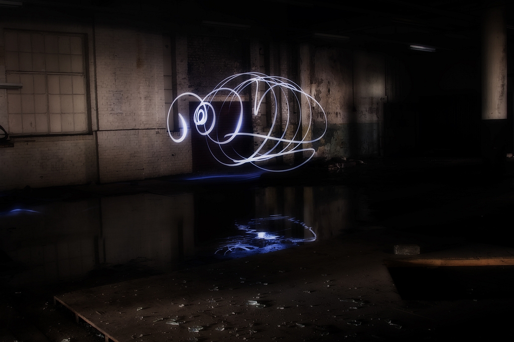 Camera zonder statief maar wel stabiel neergezet, lange sluitertijd en dan zelf al rennend met een ledlamp lightpainings maken in een urbex-locatie met een plas water met spannende resultaten, heerlijk
