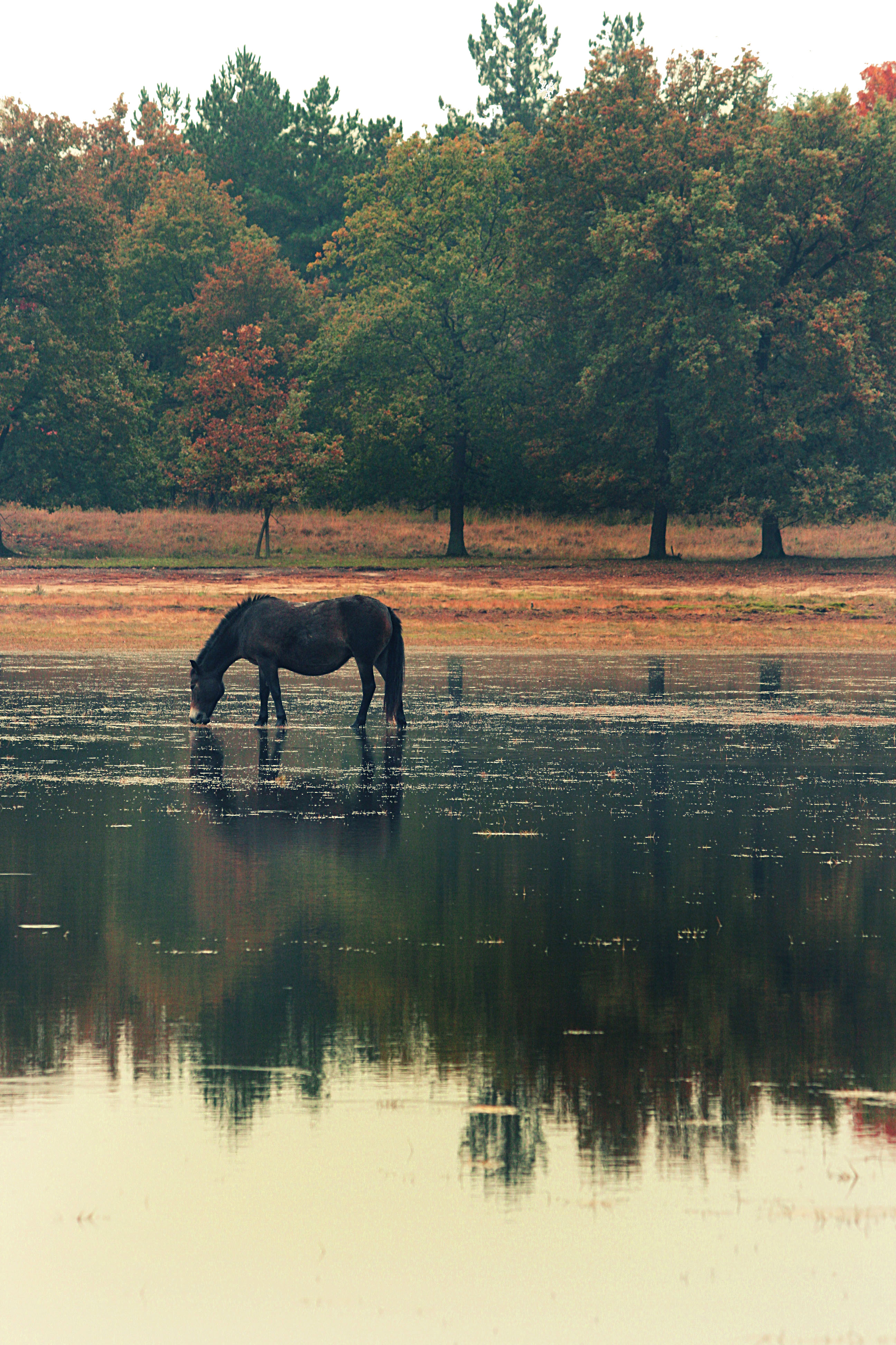 Middenin het bos ligt een klein vennetje, en daar, in het water, trof ik dit wilde paard aan.