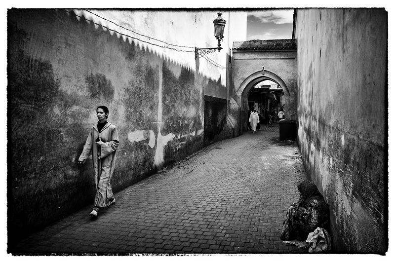 Een voorbijganger loopt langs een muur, in een poging zo ver mogelijk weg te blijven van de armoede aan de andere kant van de straat.