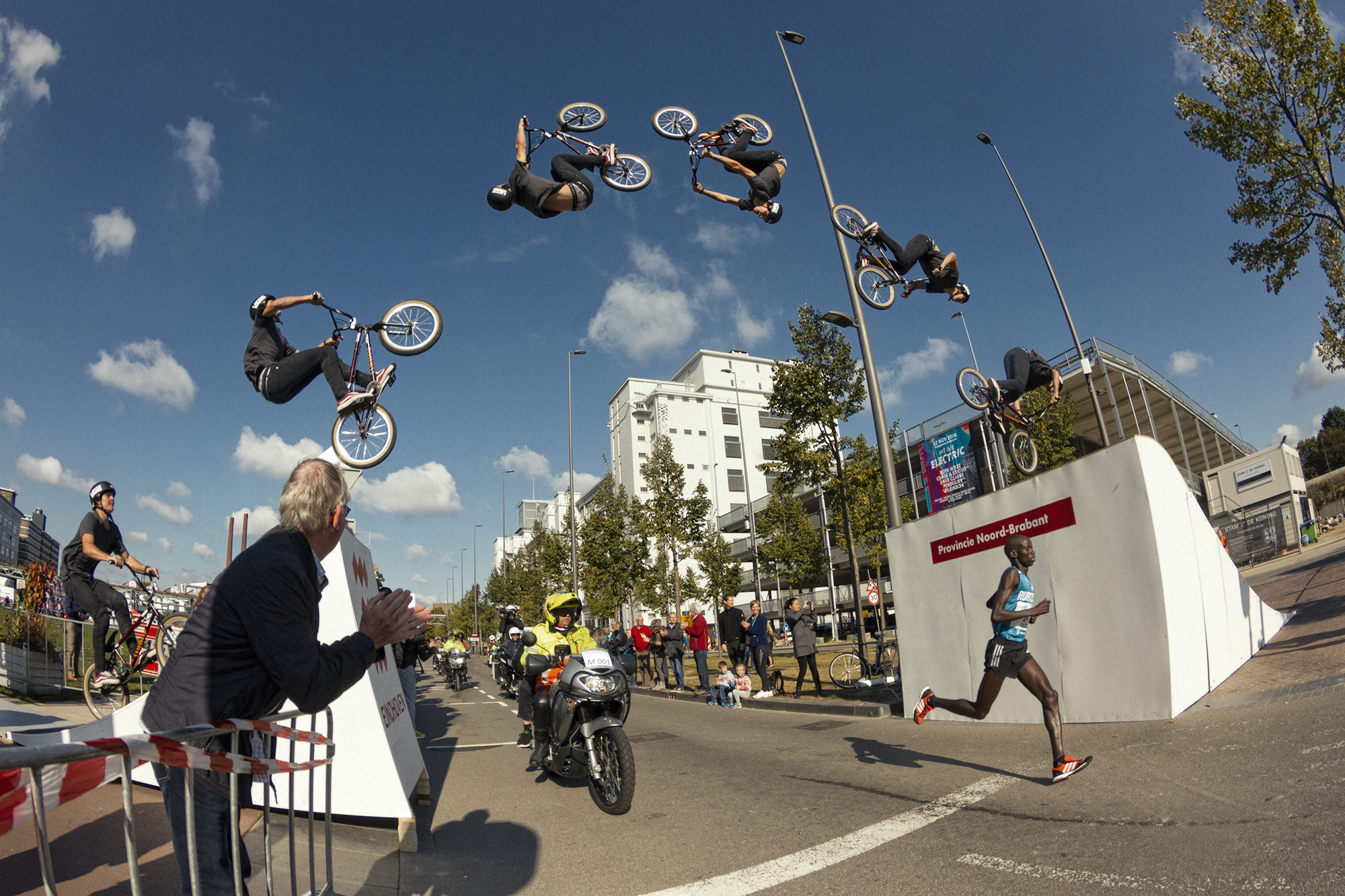 Tijdens de marathon van Eindhoven werd er gestunt gedurende de hele dag over de lopers waarbij Tom pronkte met deze backflip over de #1 loper