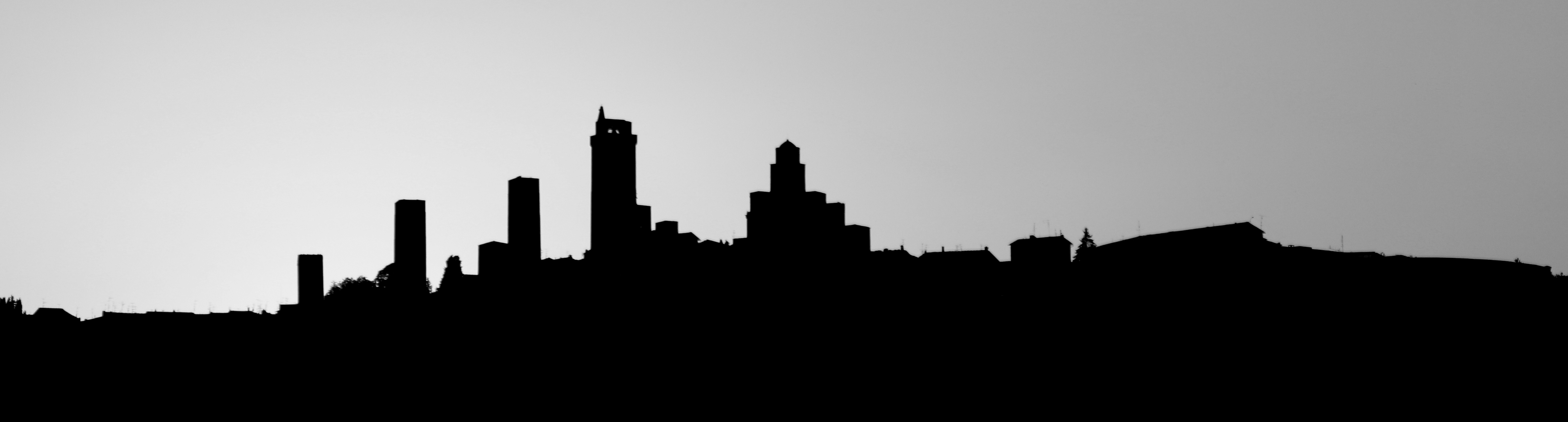 een mooie uitstap door Toscane, de zon achter een heuvel, met typische Toscaanse torentjes en kantelen....