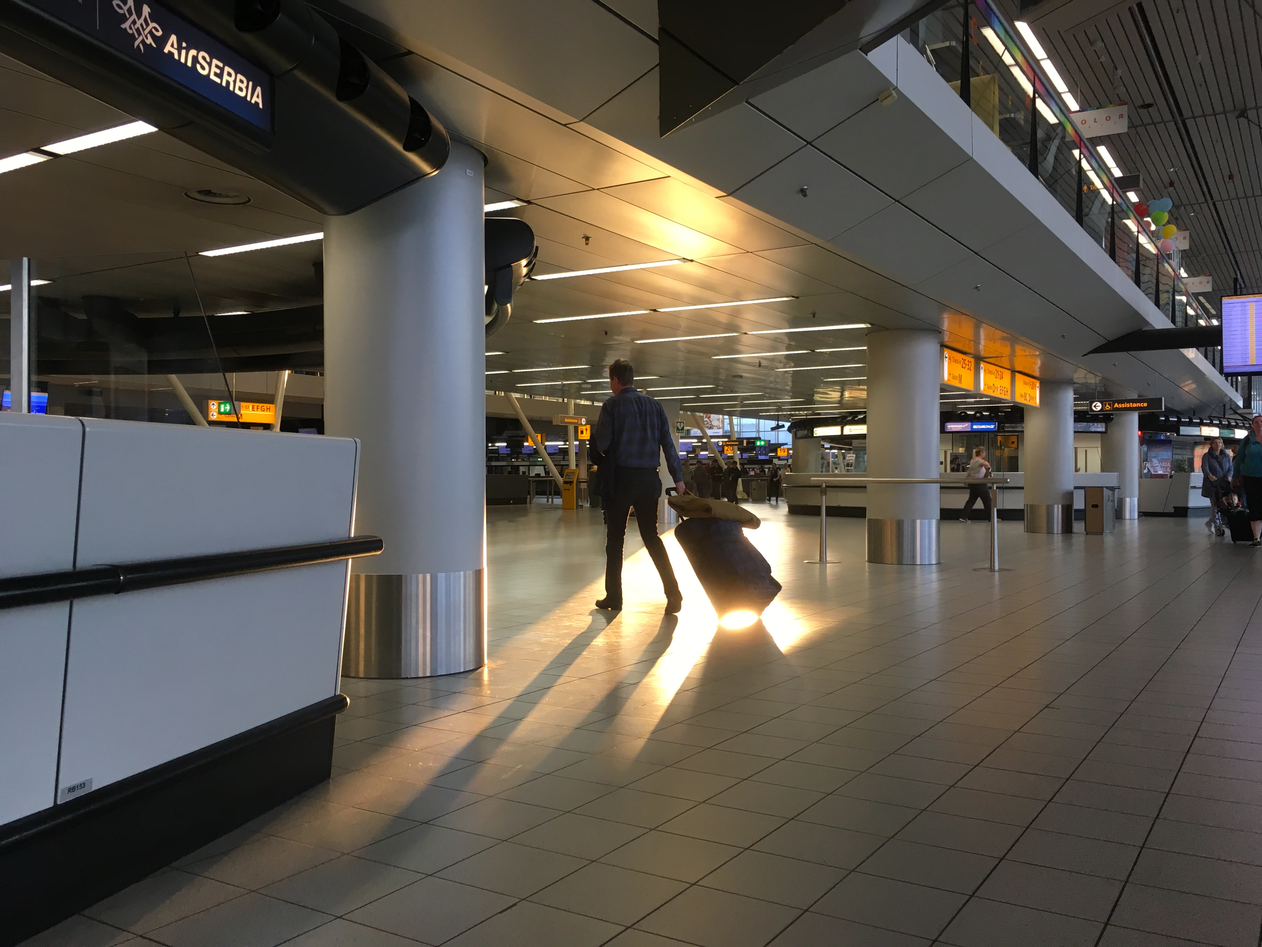 Vroege ochtend Schiphol. Ochtendlicht scheen de vertrekhal in. Het leek alsof deze reiziger in het licht verdween.