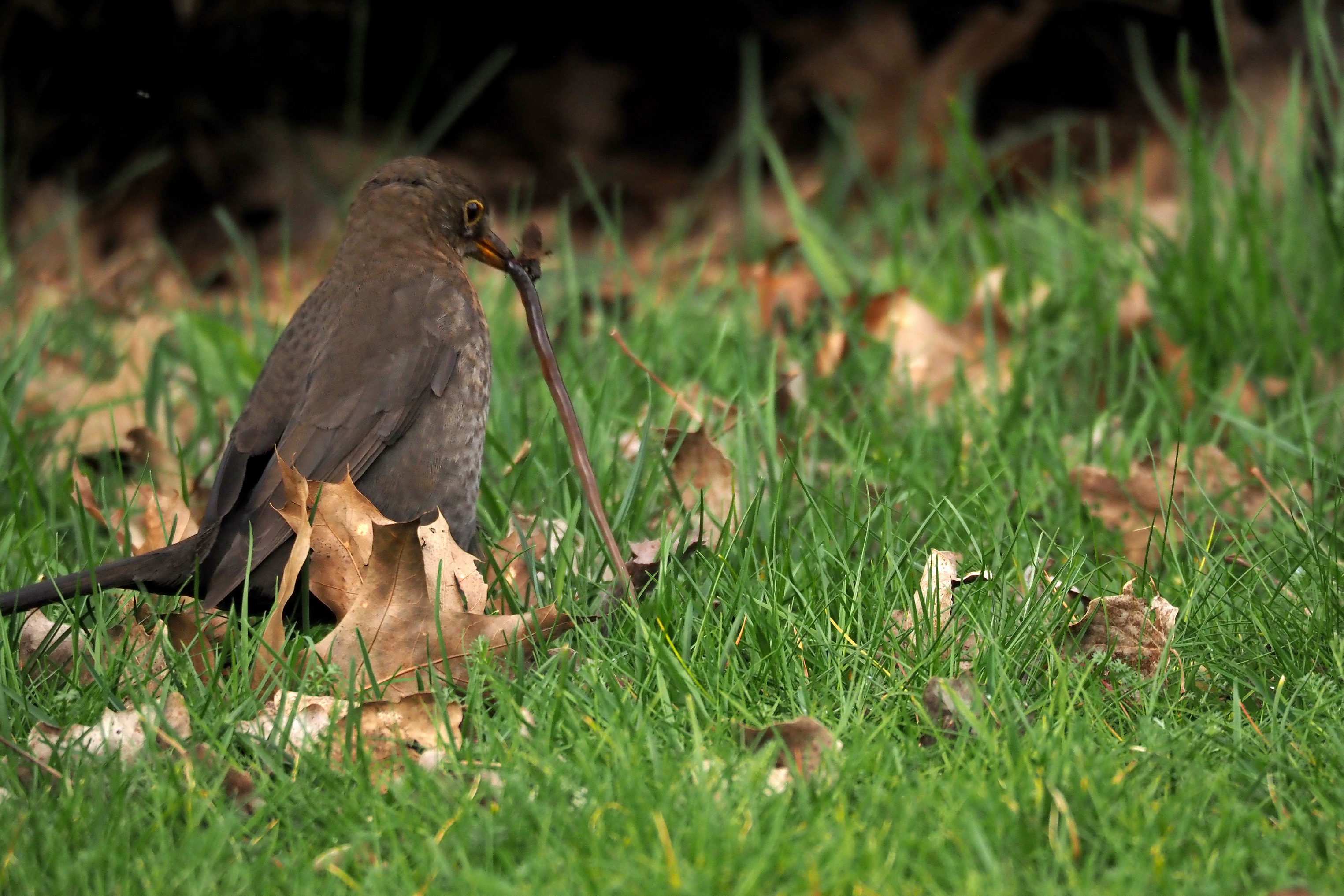 Merel trekt worm uit de grond