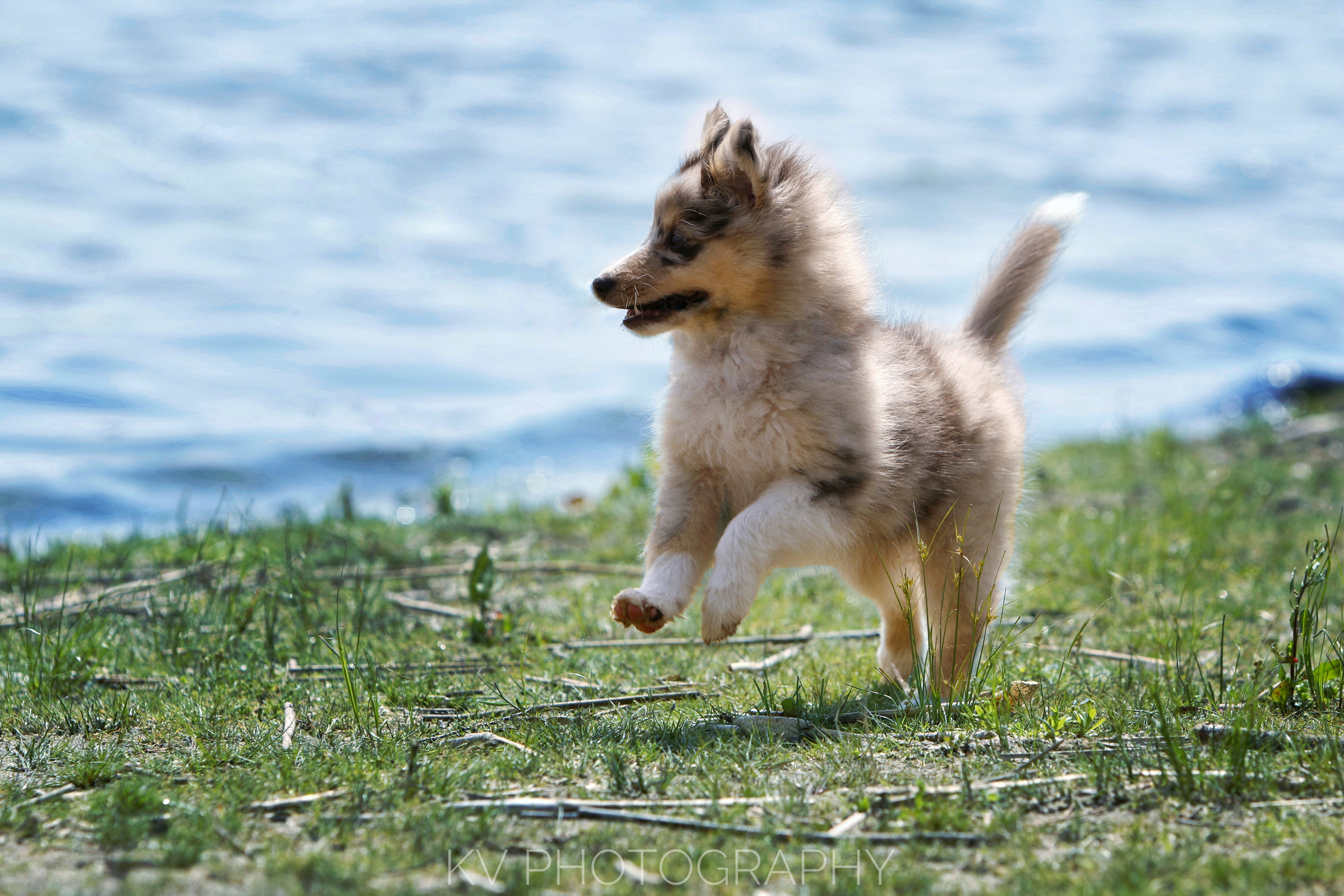 Trouble, een Sheltie-puppy op de Fotofair die maar wat graag met de vriendjes wou spelen maar er water niet in durfde.