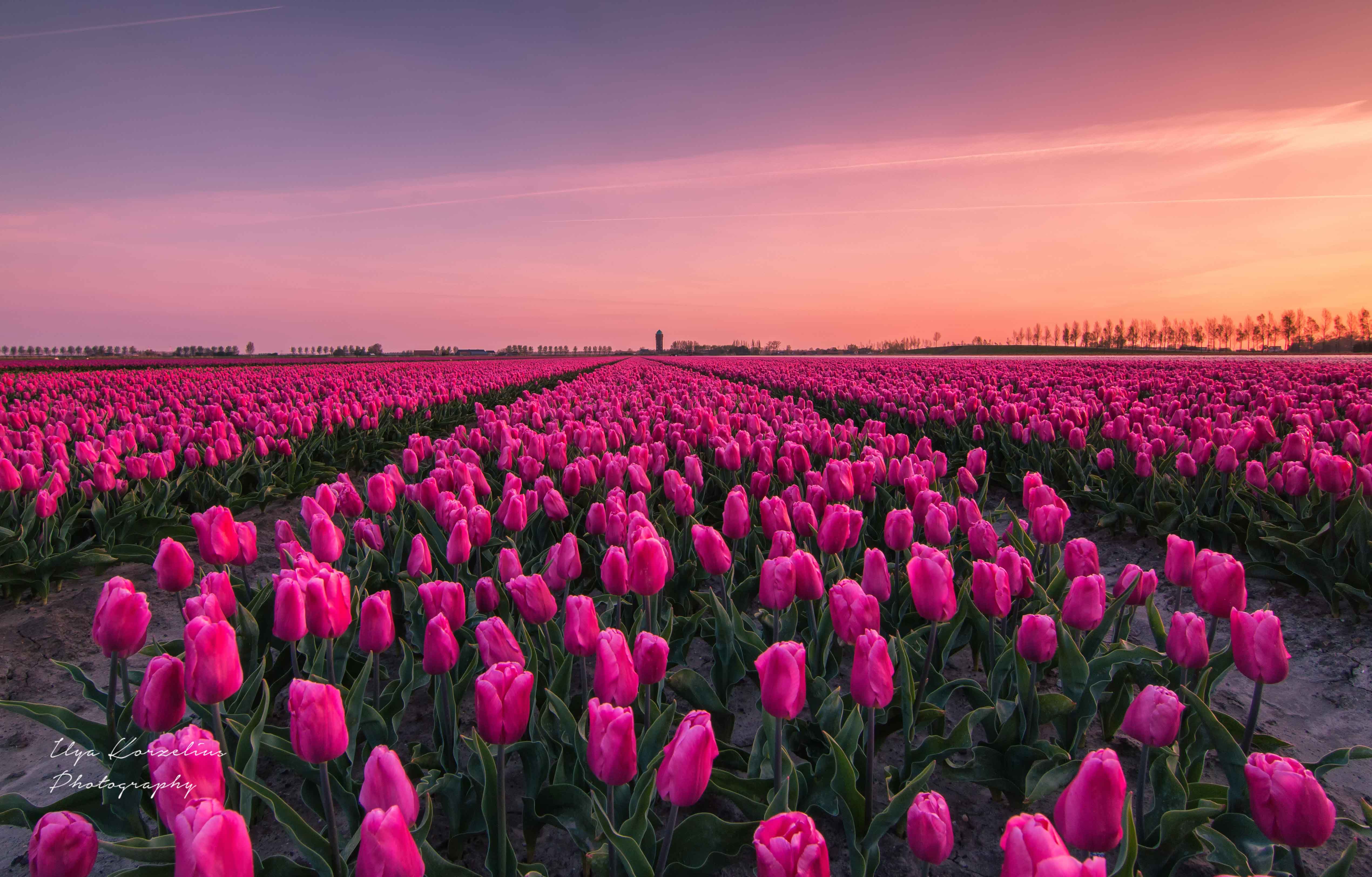 Tulpenvelden bij Oude Tonge tijdens zonsopkomst.