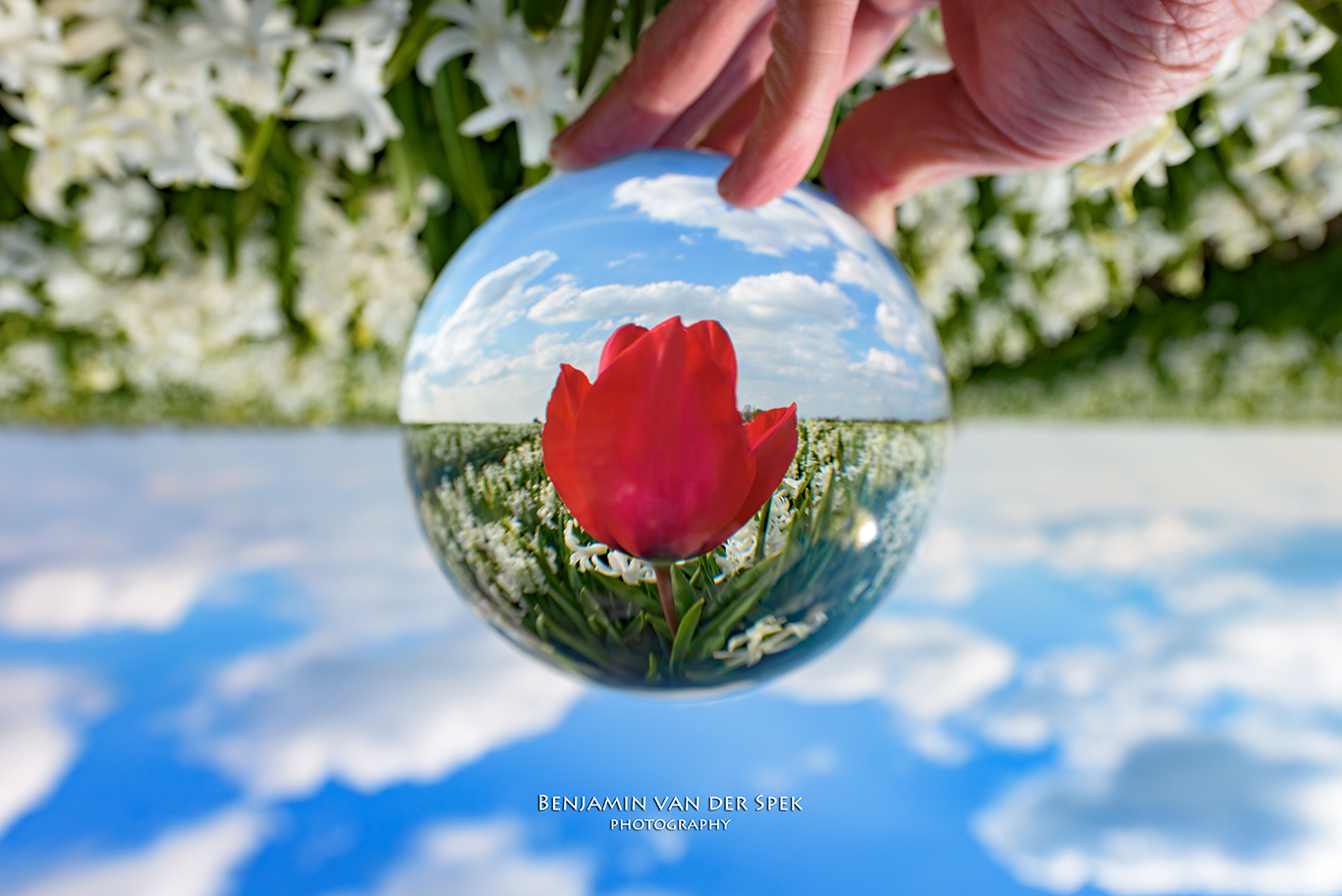 Een rode tulp in een veld van witte hyacinten , gezien door een kristallen bol.