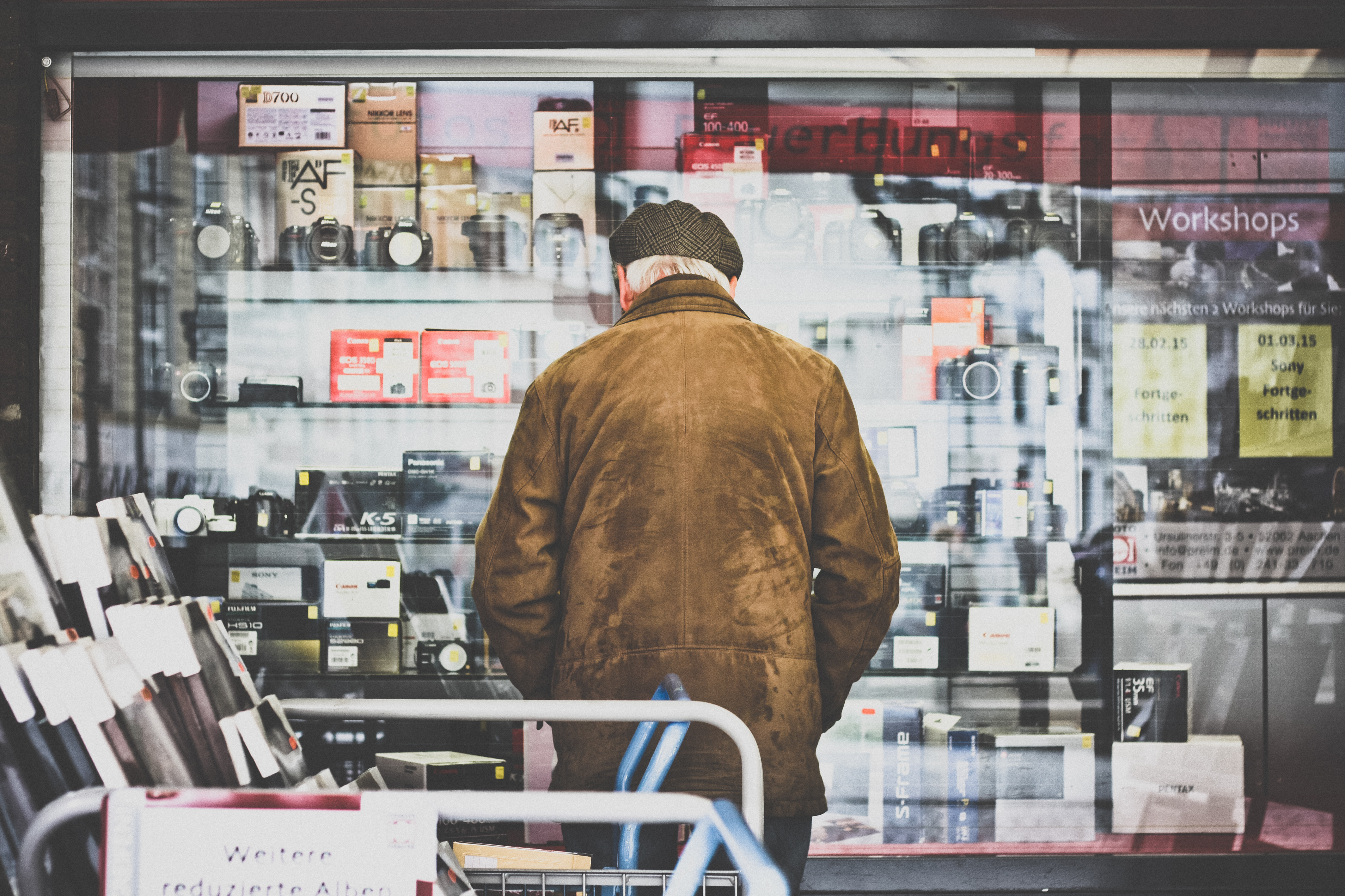 Man kijkt naar tweedehands camera's en lenzen in de etalage.