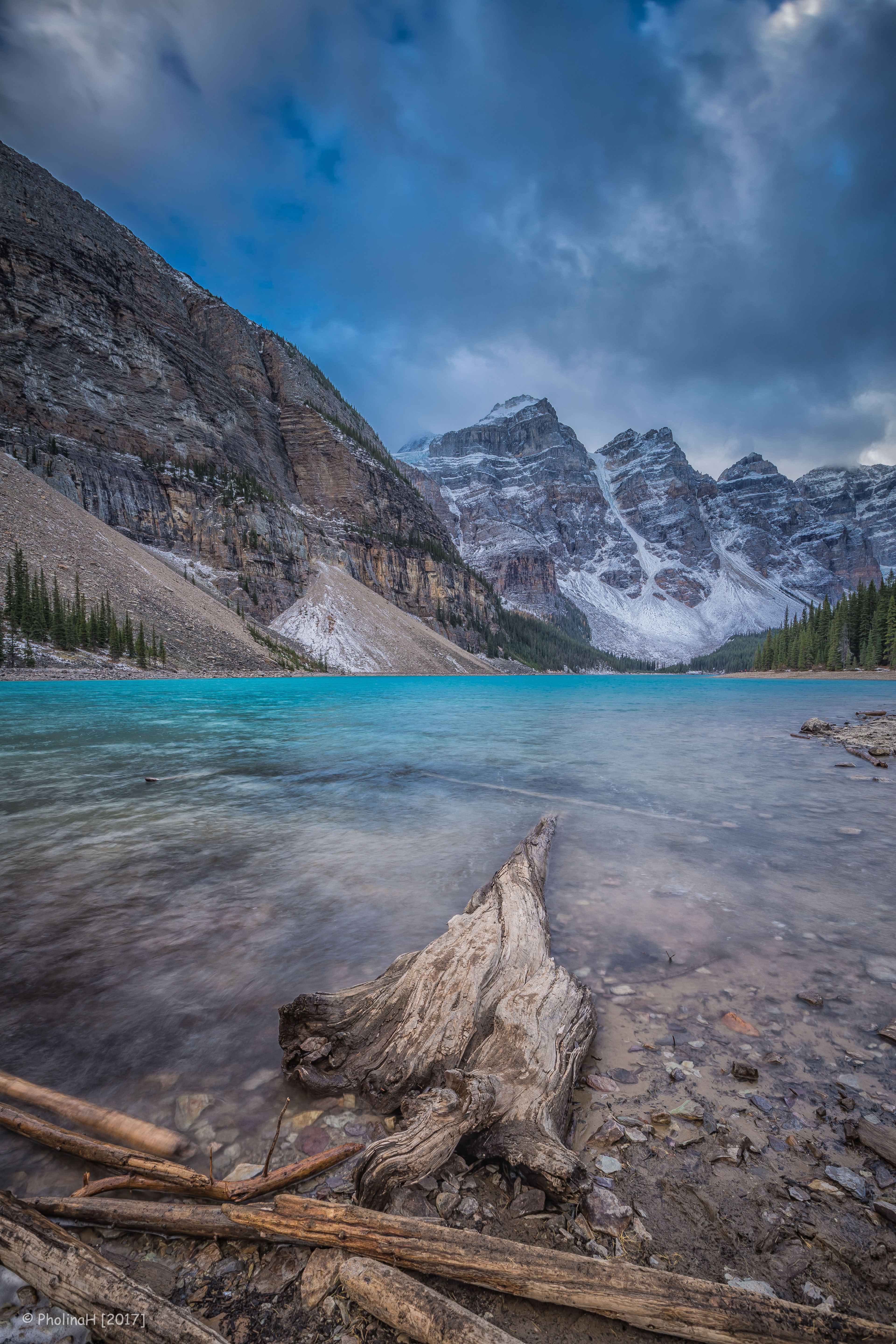 Het indrukwekkende Moraine Lake, vlak bij Lake Louise in Banff National Park, Alberta, Canada. Een afbeelding van dit meer heeft lang op het Canadese 20-dollarbiljet gestaan.