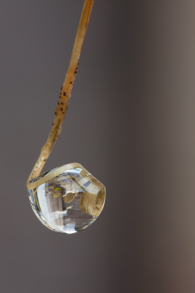 Het twijgje is in de druppel gedraaid en het beeld achter de druppel wordt door de lenswerking van het water gedraaid, vandaar de titel.