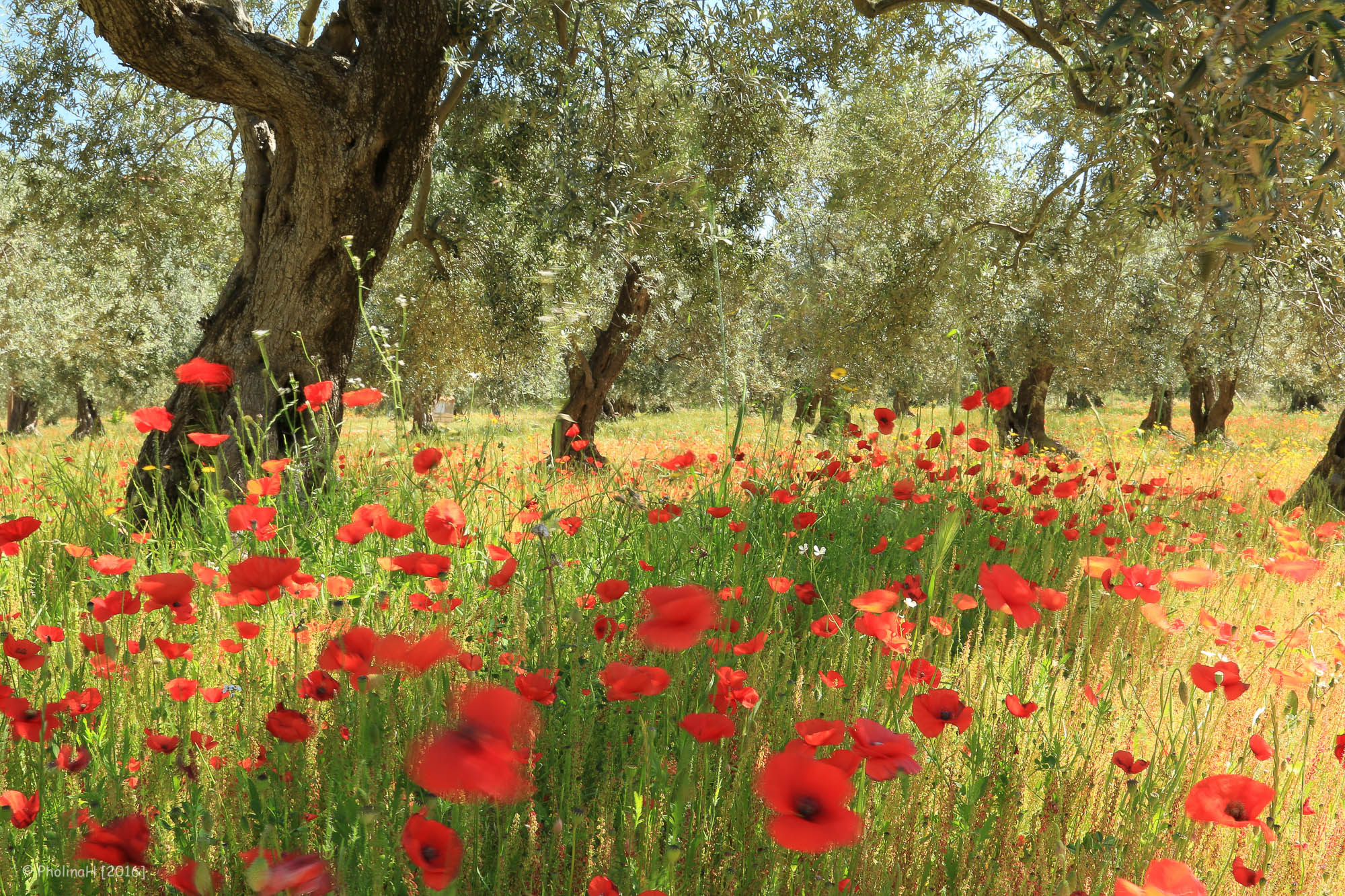 Olijfbomen en klaprozen op de vruchtbare west flanken van de Etna op Sicilië in mei.