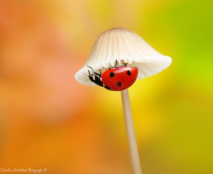 Een LHB-tje onder de kap van een zwammetje. Twee seizoenen ontmoeten elkaar... Een leuk beeld voor een kinderkamer of zo?