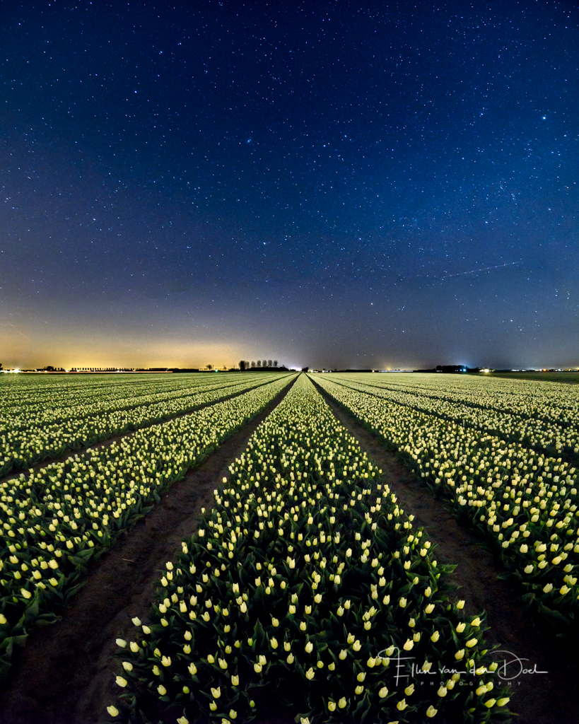 Het was een zwoele windstille avond en rustgevend om daar te staan onder de sterrenhemel kijkend over een prachtig tulpenveld.