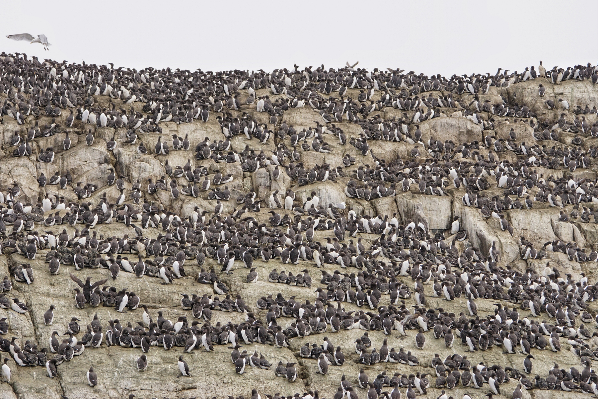 Tegen de klif op Farne Island is het een drukte van jewelste. Hier zie je vooral zeekoeten