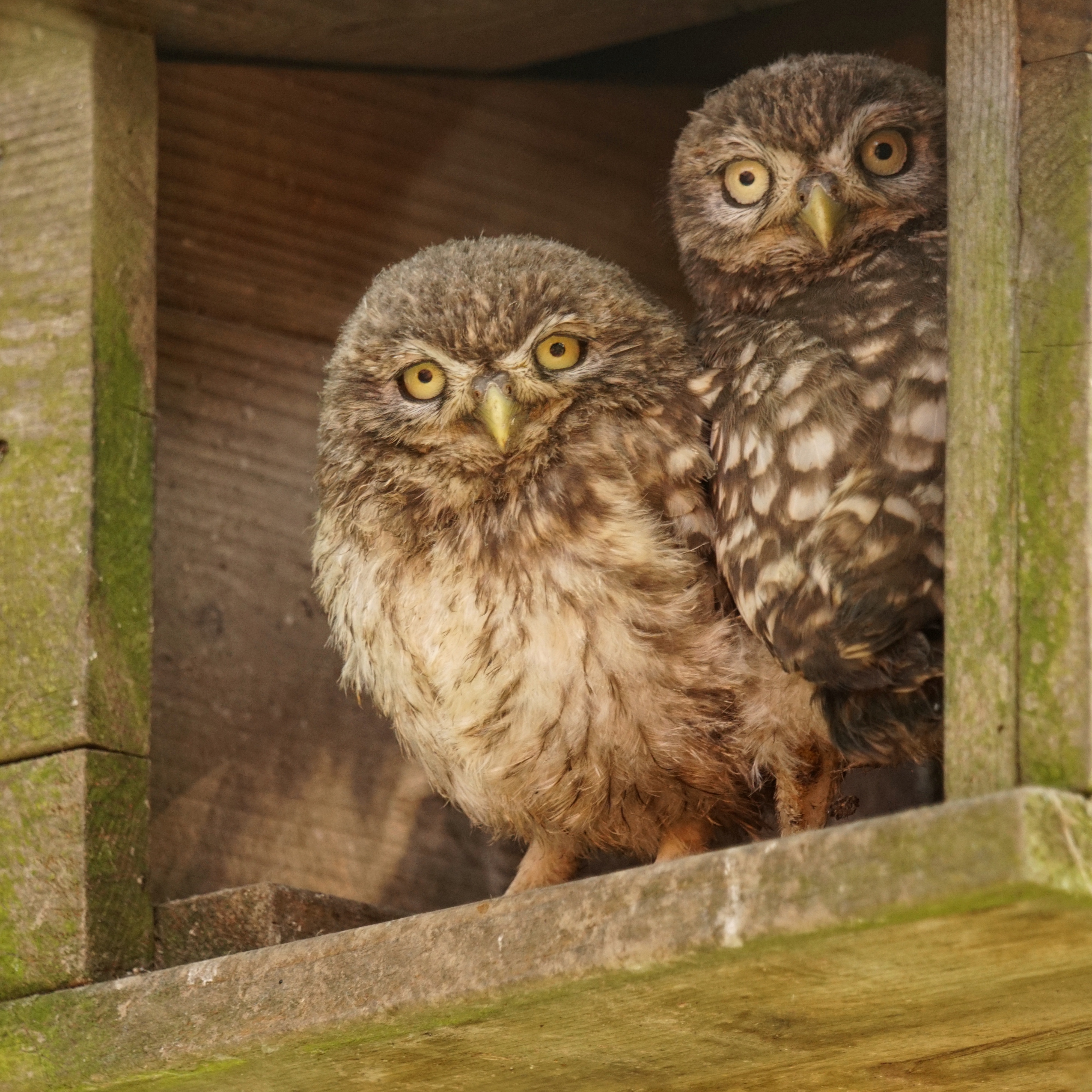 Verscholen in het dakraam van de boerderij kon ik deze twee steenuilen jongen observeren en fotograferen