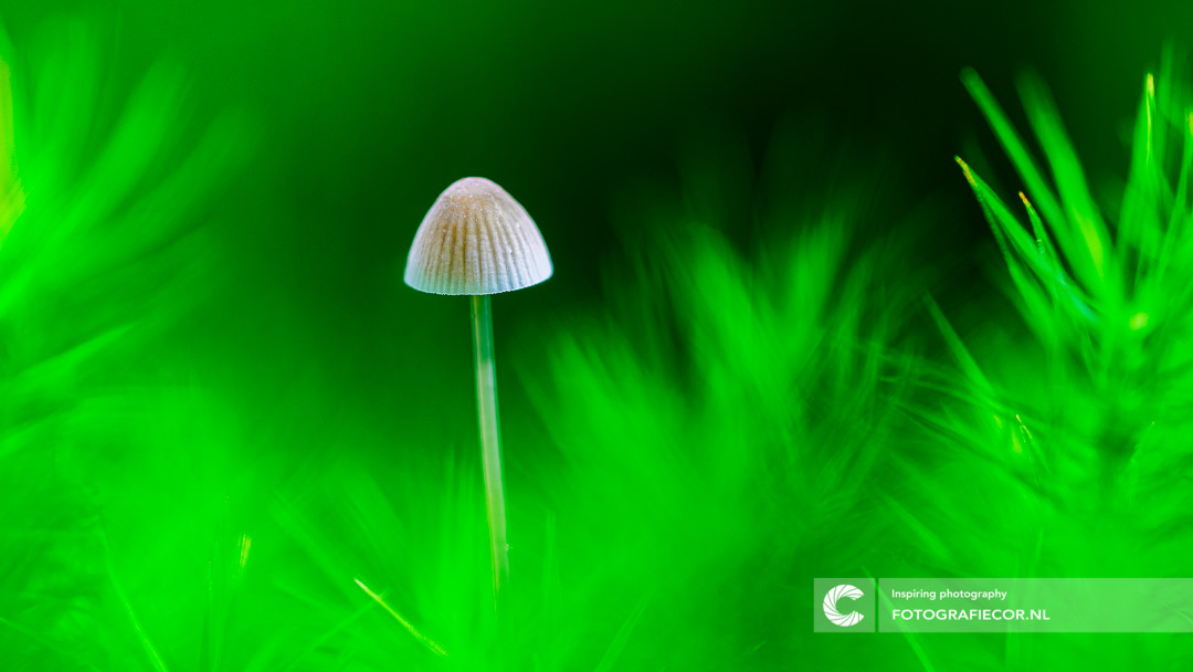 Niet groter dan je pink en je loopt er zo aan voorbij. Blijft mooi hoe je met macrofotografie steeds opnieuw een fascinerende wereld kan blijven ontdekken. De groene kleur van het mos heb ik hier gebruikt om een kader rond dit kleien grijze zw te gebruiken.