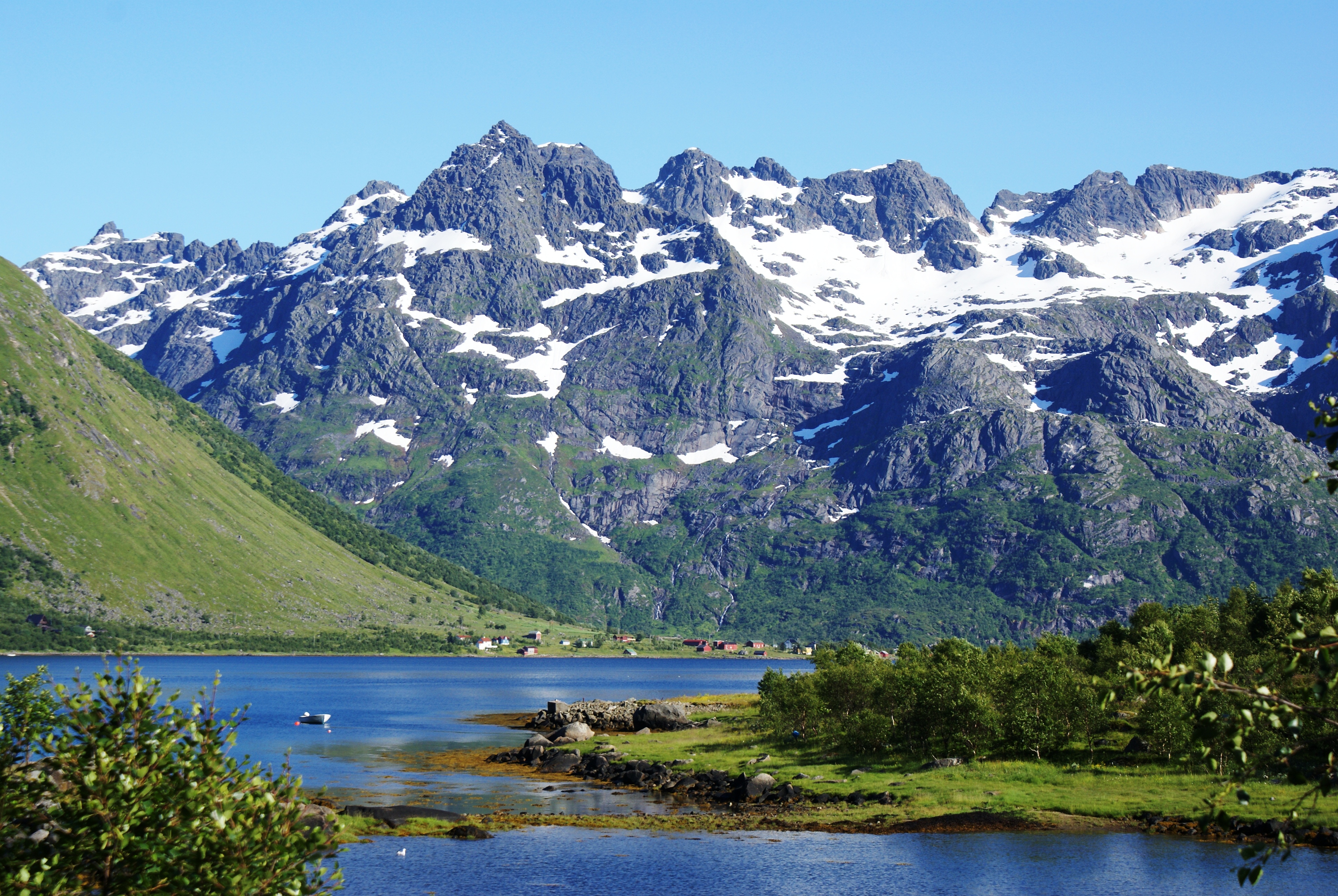 Van de Vesteralen naar de Lofoten zag ik dit schitterende zicht op de besneeuwde bergen.