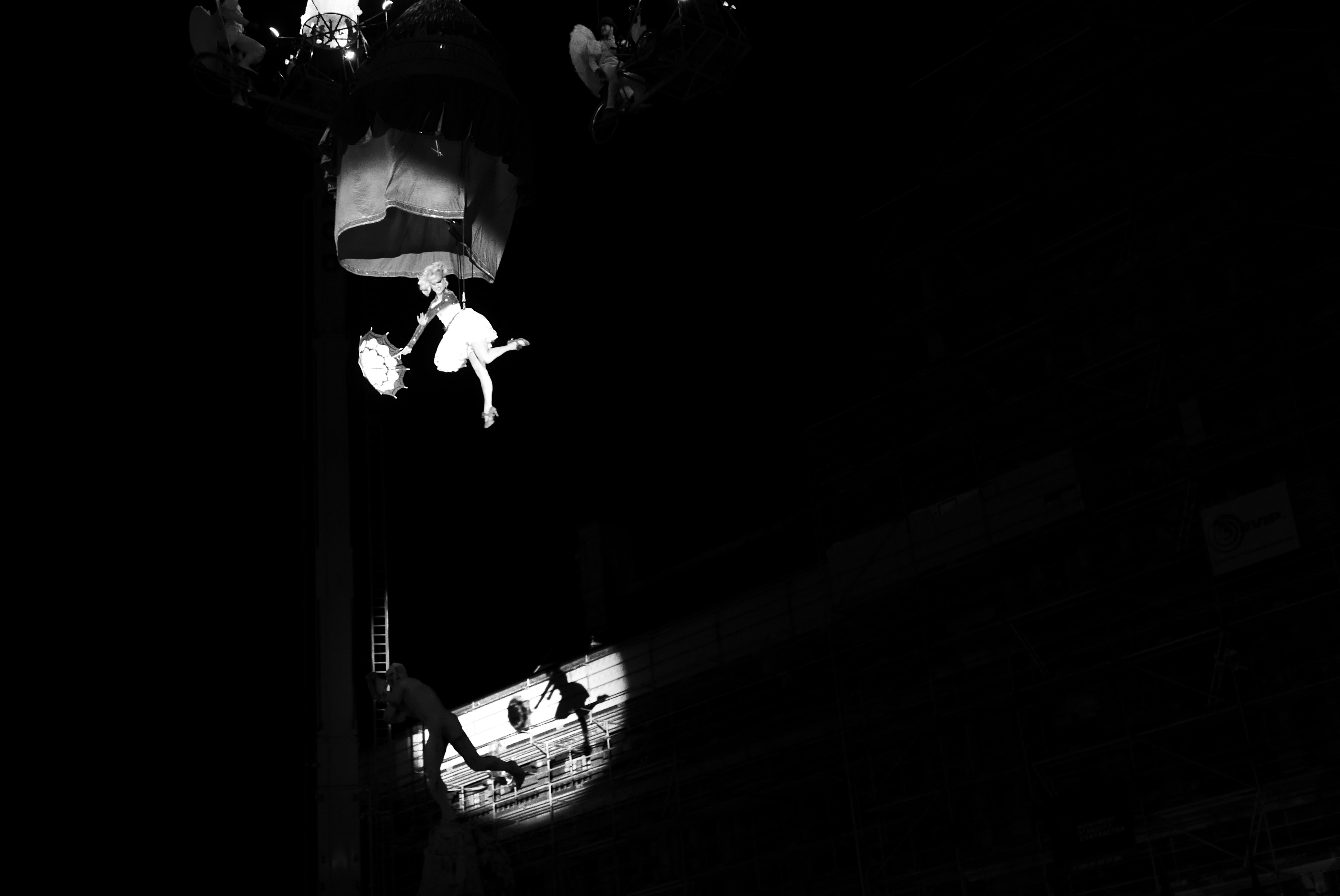 Danseres van het Tol theater zwiert over het Brabo monument ter ere van het 500 jarige bestaan van de "Onze-Lieve-Vrouwekathedraal" van Antwerpen.