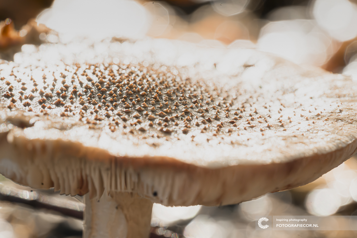 In de herfst is er zoveel vast te leggen en zijn er oneindig veel variaties te vinden van paddestoelen in alle soorten en maten. Met fotograferen kan je ze registreren , determineren of portretteren maar ik kies er ook vaak voor om de sfeer te vangen. Focus, scherptediepte, bokeh, lichtrichtingen, diafragma, perspectief, achtergond en bedenk nog maar meer, helpen je creativiteit om een beeld te geven aan wat je ervaar bij het bekijken van zo'n herfstbeeld. In dit geval een dromerig beeld van een bruine zwam met stippen welke zijn restanten van het omhulsel waarin de paddenstoel onder de grond opgesloten zat. Deze stippen spoelen bij regen vrij snel van de hoed af en variëren n dan ook in patroon en dichtheid. De kleur van de hoed kan variëren van donkerrood tot geel. Vliegenzwammen groeien vaak in de buurt van bomen zoals berken, tamme kastanjes of eiken.
