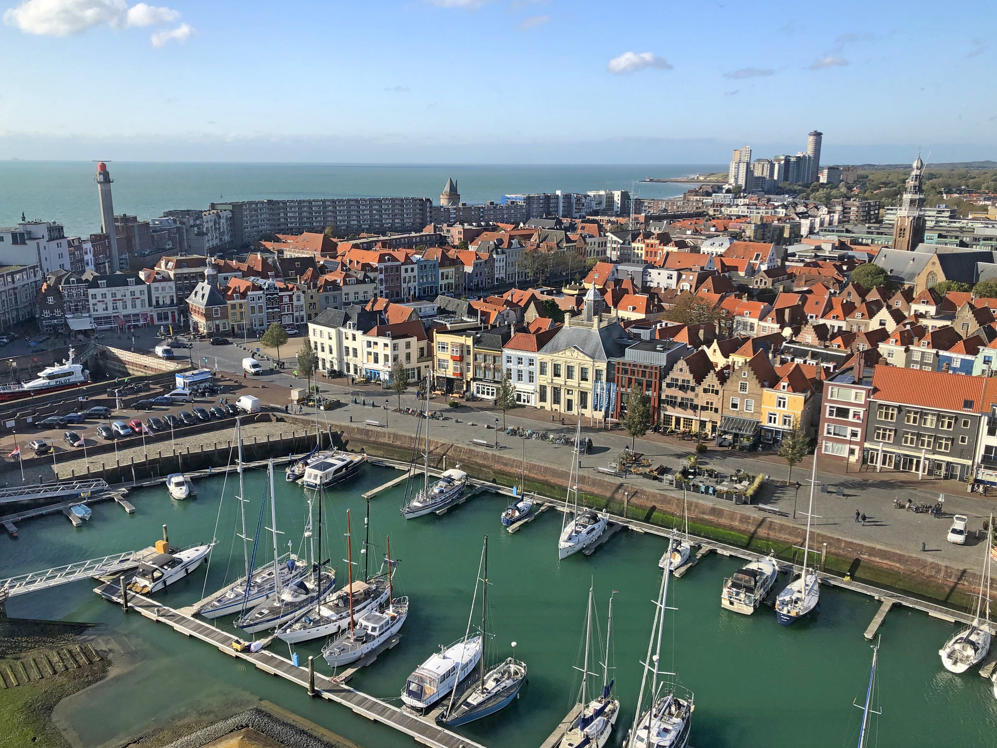 Foto gemaakt vanuit de uitkijktoren van Vlissingen Arsenaal naar de stad en de haven.
