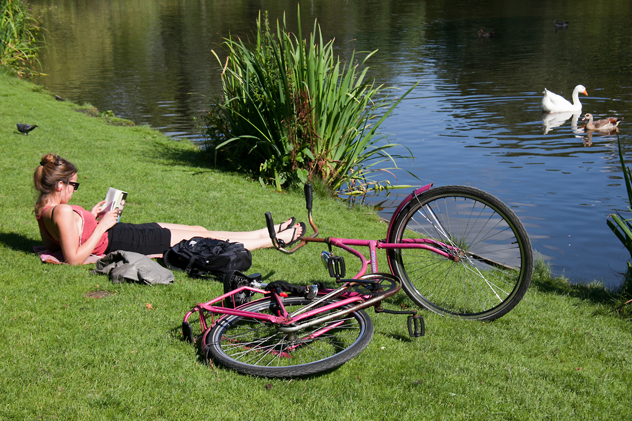 Zoals van deze dame die Lekker ligt te lezen bij een vijver