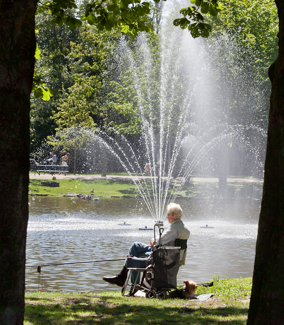 Lekker zitten vissen in het park vlak bij de fontein , wat is er nou mooier?