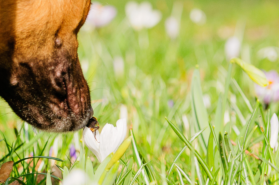 Myla is nieuwsgierig naar een hommel op een krokus.