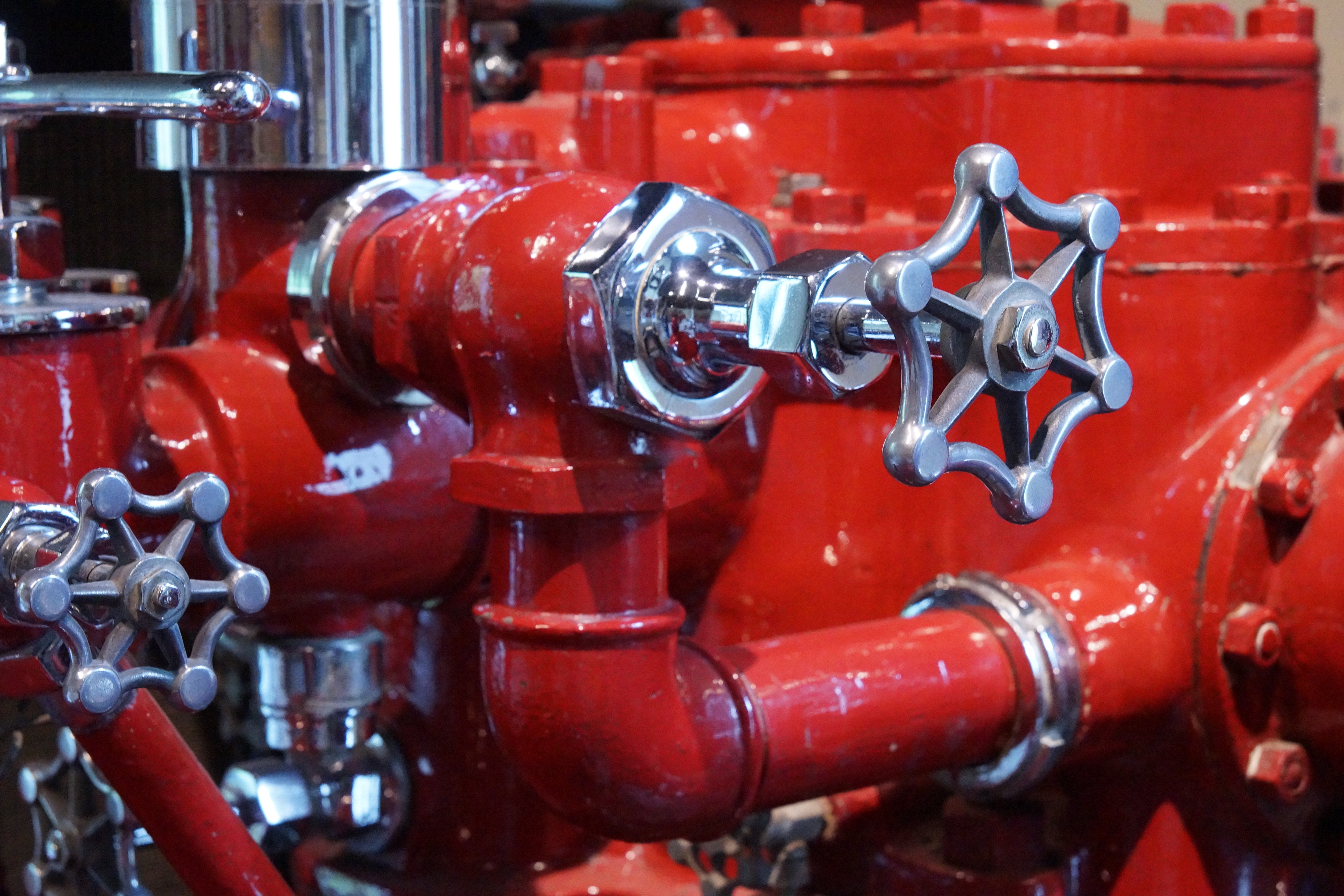 Close up van een ouderwetse brandweerwagen met dank aan het Louwman Museum.